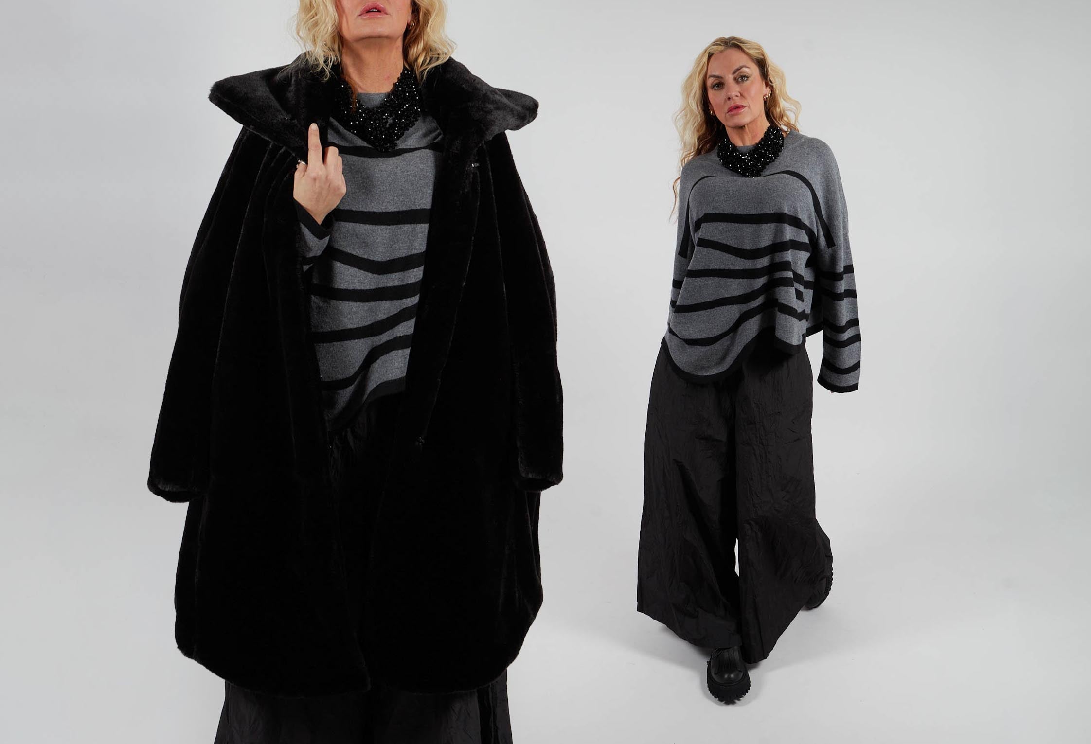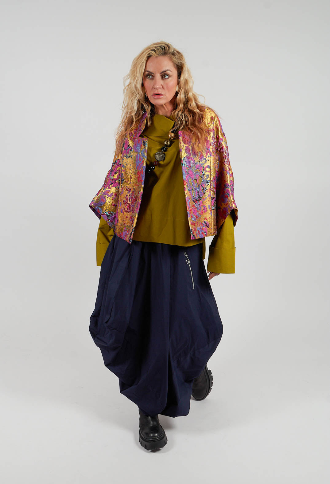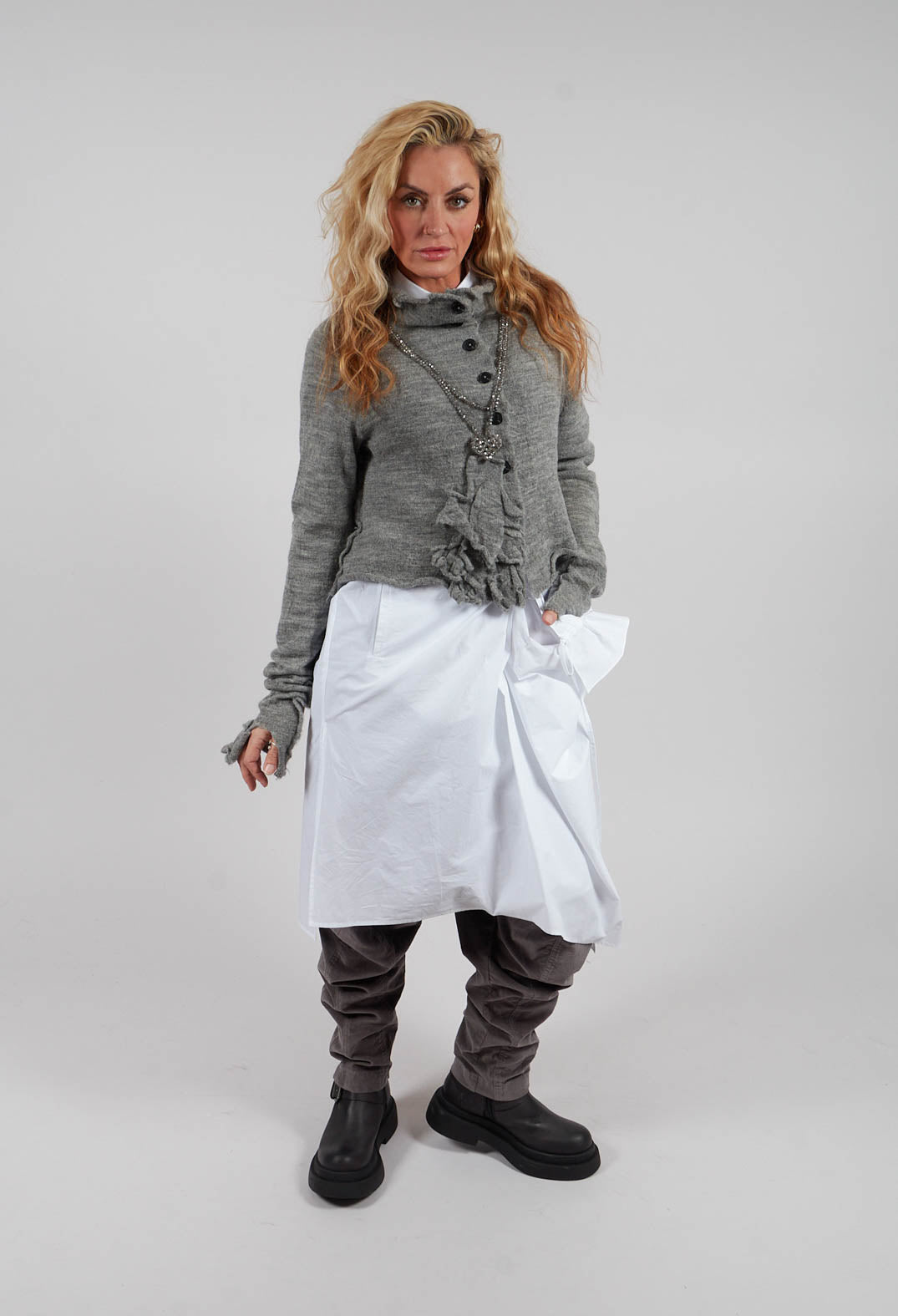 Işık Özgür’s designs lend themselves effortlessly to layered, modern looks that balance structure with softness. Start with an elevated transition into evening, opt for a tailored trouser paired with an asymmetric top—this combination speaks to Özgür’s love of architectural shapes and movement. Add a statement jacket with exaggerated lines or textured fabric finishes the look, bringing a sense of quiet drama.