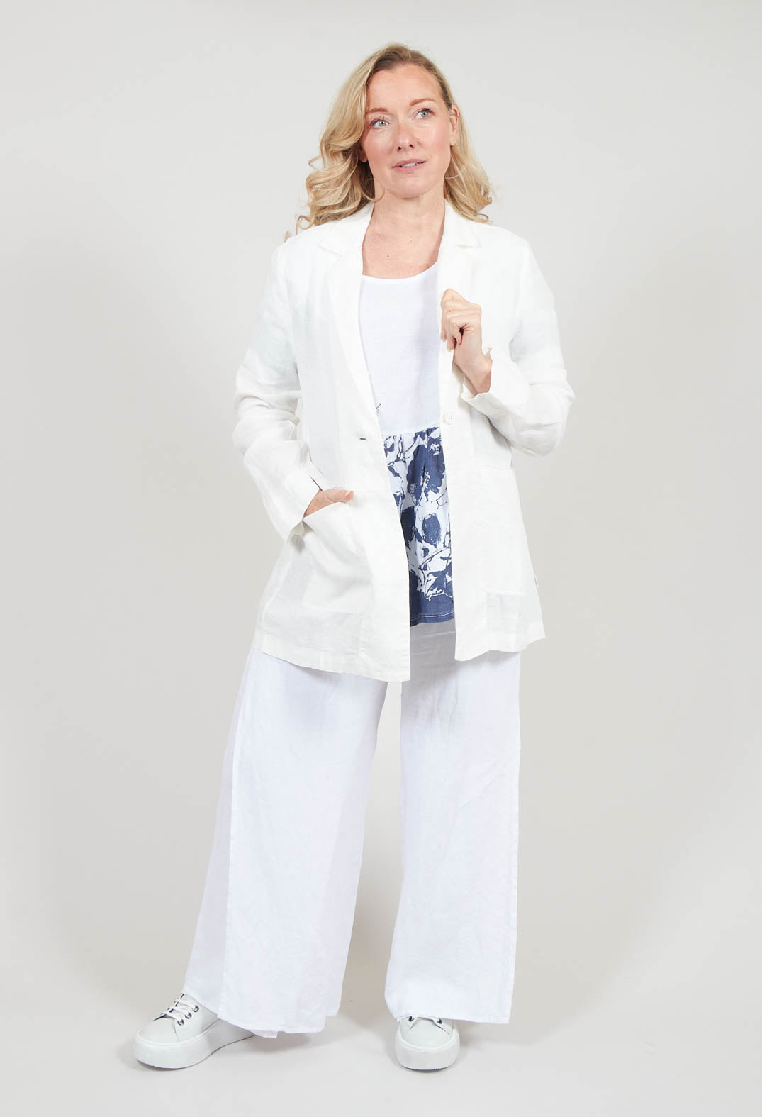 Blue Placement Print Linen Top in White by Blueberry