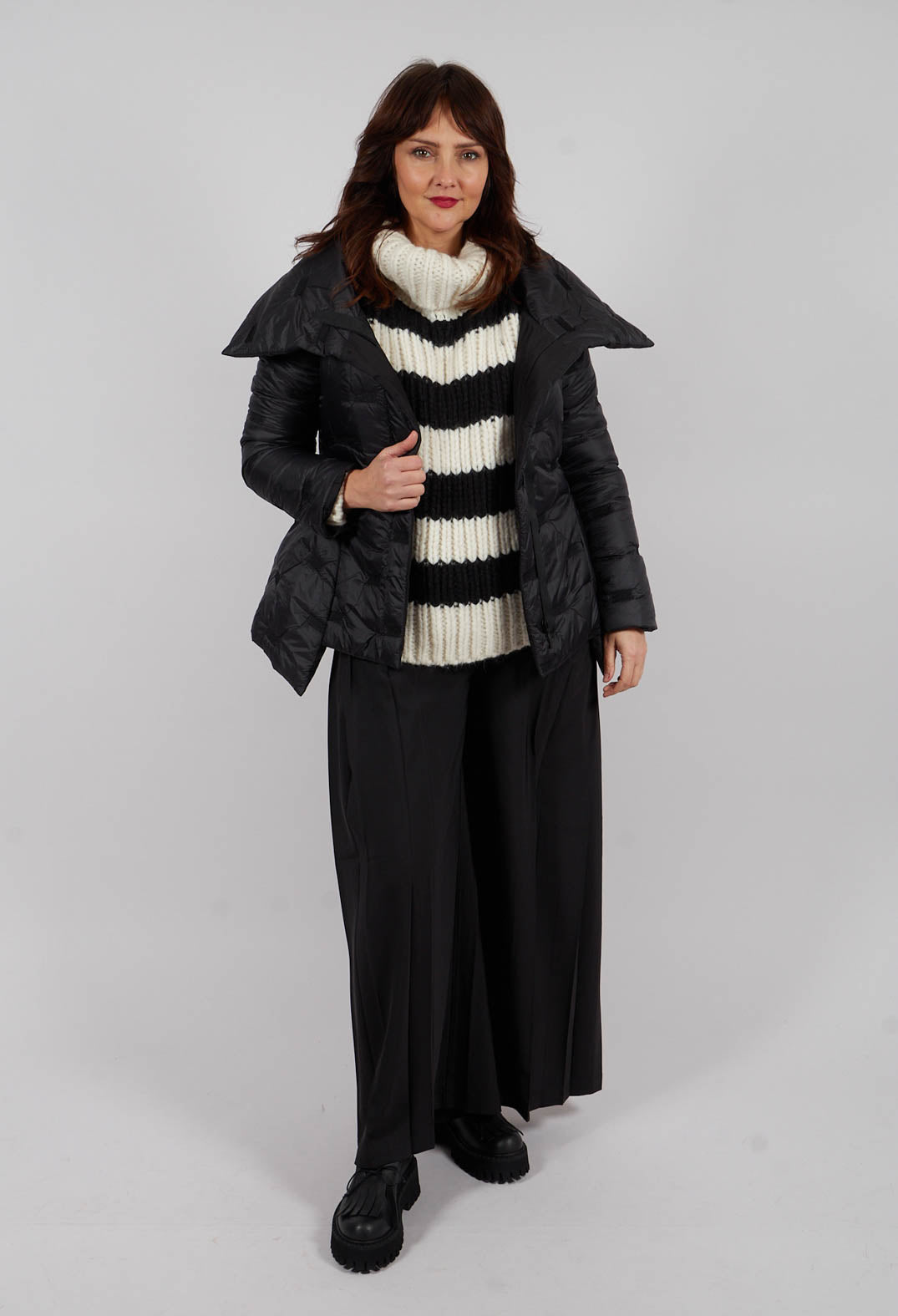 These black trousers effortlessly blend contemporary style with timeless elegance. Featuring a wide-leg design, they offer a relaxed yet sophisticated silhouette, with pleats running down the front for added texture and volume. The lightweight fabric drapes beautifully, creating an airy and fluid fit that moves with ease. Thoughtfully designed with two buttoned back pockets, belt loops, and a decorative strap with a metal ring at the back, these trousers are the perfect balance of functionality and style. Whether dressed up for the office or paired with a casual top for a weekend look, they bring a touch of modern flair to any outfit.