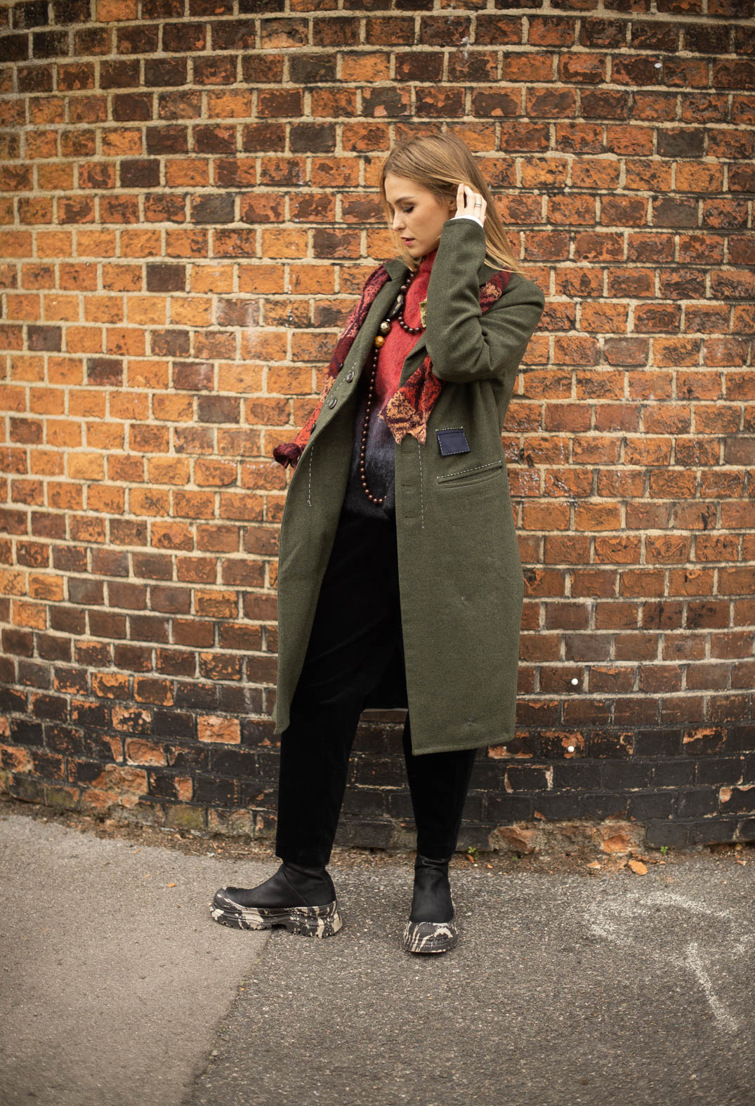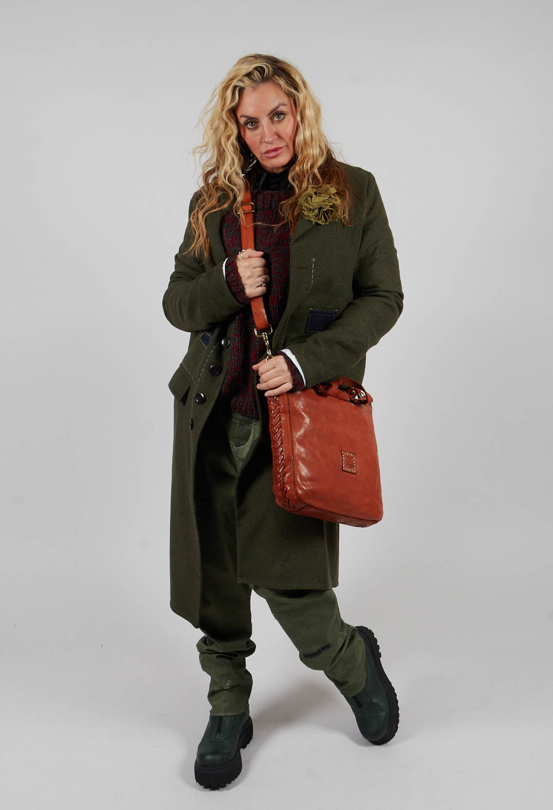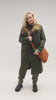 Brooch Detail Long Coat in Original Green by Umit Unal