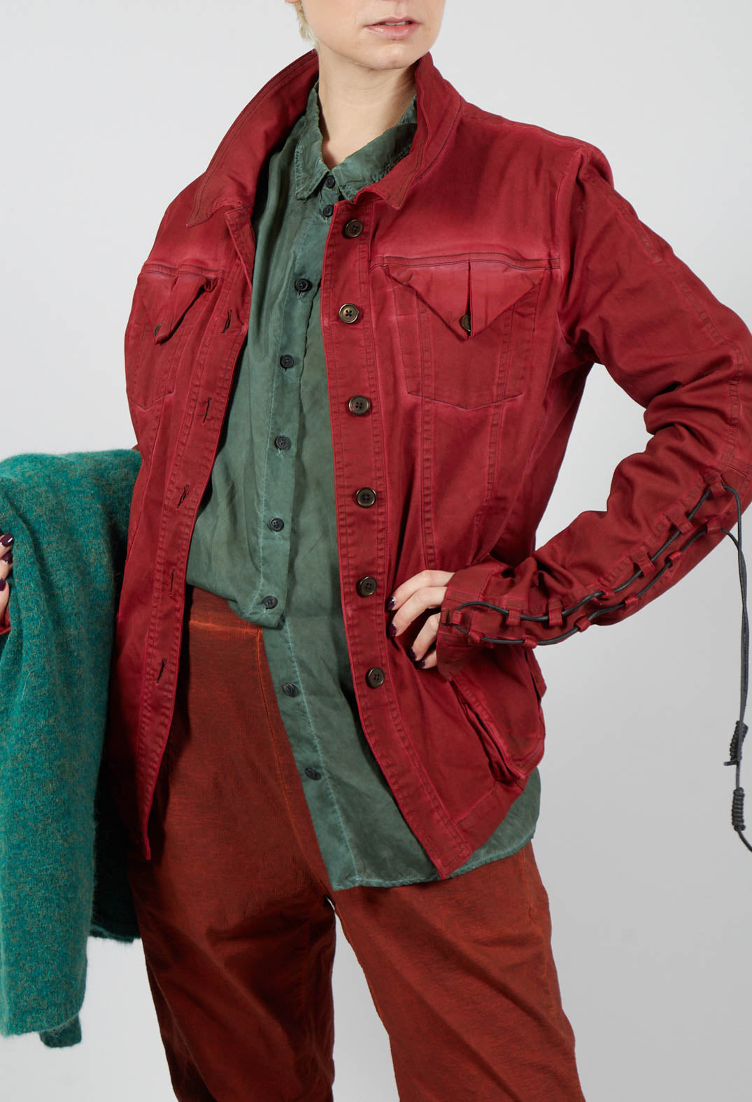 This deep red jacket offers a perfect balance of structure and casual edge. With its tailored design, visible stitching, and button-up front, it exudes a refined yet relaxed aesthetic. The jacket features large patch pockets on the front, adding both functionality and style, while the lacing details on the sleeves, finished with black cords, introduce a subtle touch of boldness. The adjustable drawstrings at the sleeve hems allow for a customizable fit, enhancing its utilitarian charm. Crafted from a sturdy cotton blend, this jacket is both durable and stylish, making it a versatile addition to your wardrobe for both laid-back and polished looks.