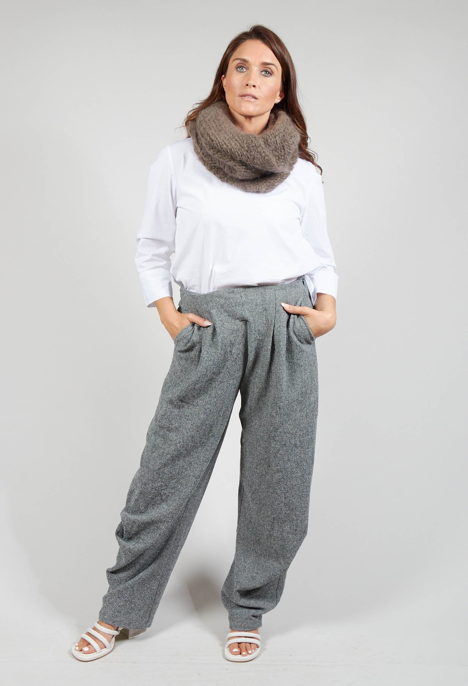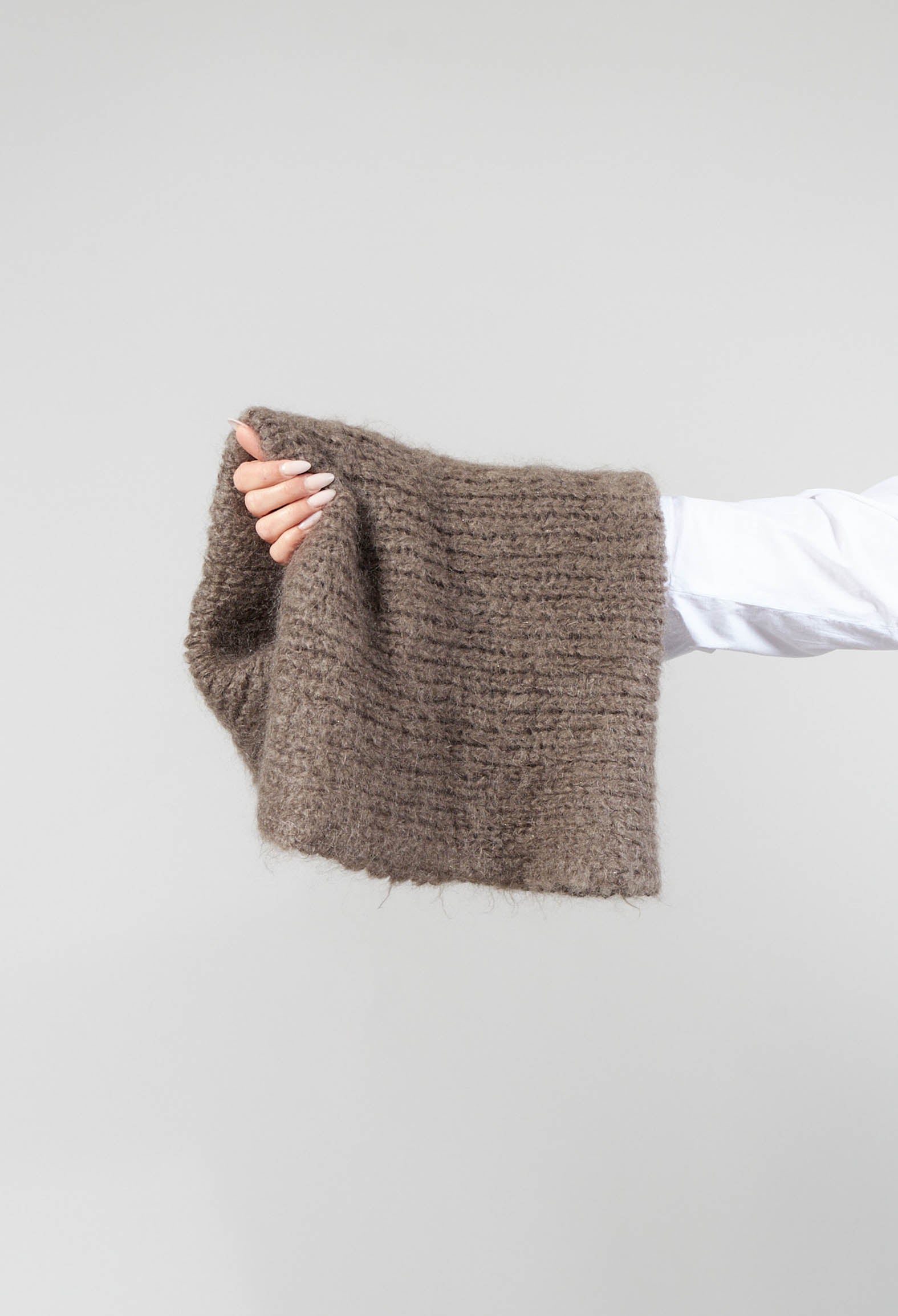 Delightfully soft, mohair snood in a loose knit, with slivers of metallic thread running through it.