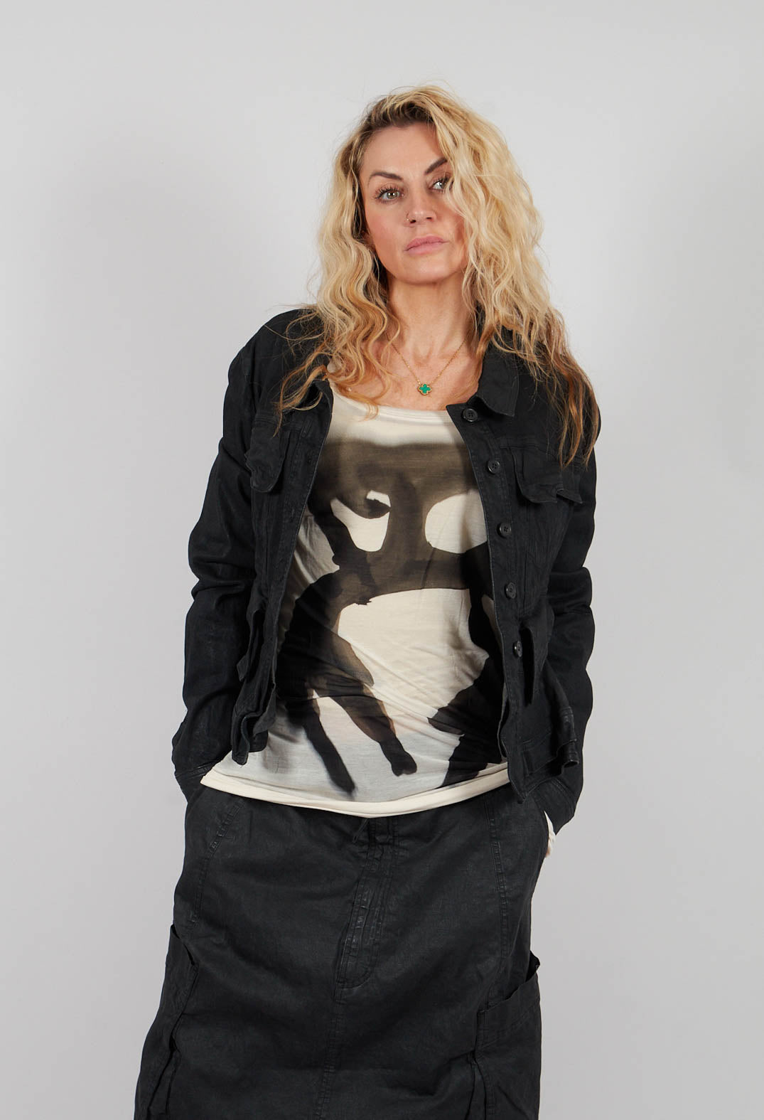 Cropped Jacket with Frilled Hem in Black Gloss - 1031103