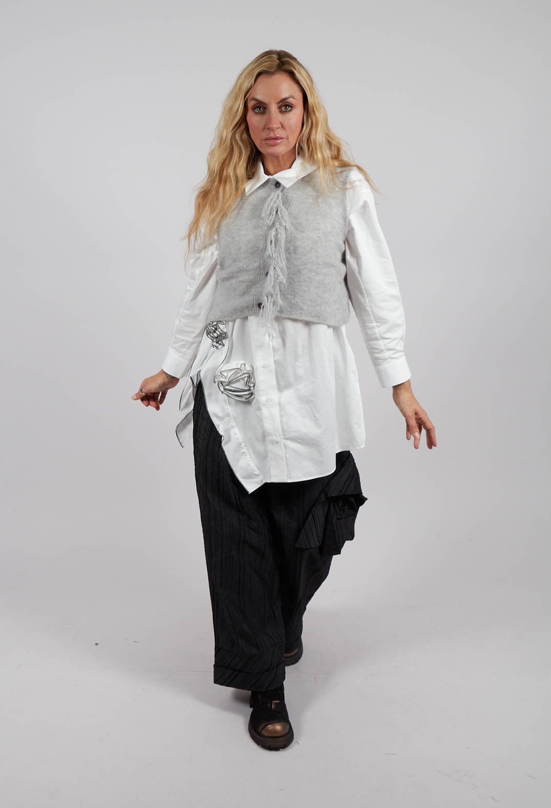 This cropped grey cardigan combines contemporary style with cosy charm, featuring a soft, fuzzy knit texture that enhances its relaxed appeal. The striking contrast of long black sleeves, made from a different fabric, adds an intriguing two-tone effect to the piece. Finished with a central button closure and subtle fringe detailing running vertically along the front, this cardigan offers a unique and stylish twist on a classic wardrobe staple. Perfect for layering over a blouse or dress, its versatile design effortlessly adds a touch of modern elegance to both casual and smart looks, while the cropped cut keeps it fresh and contemporary.