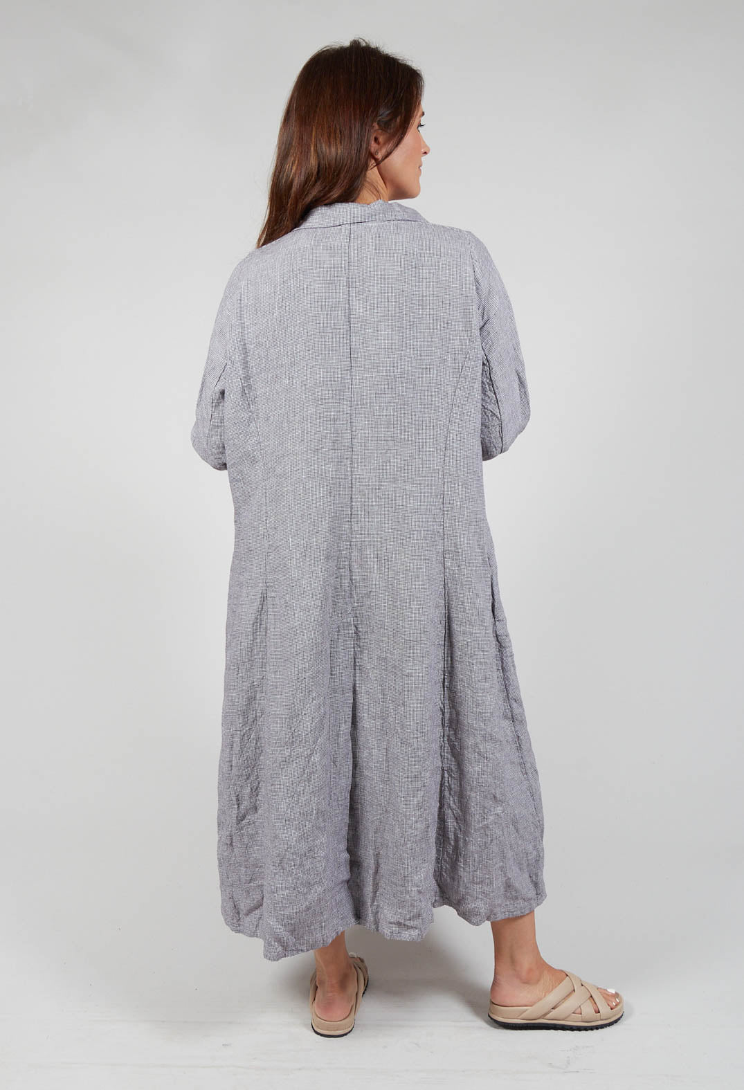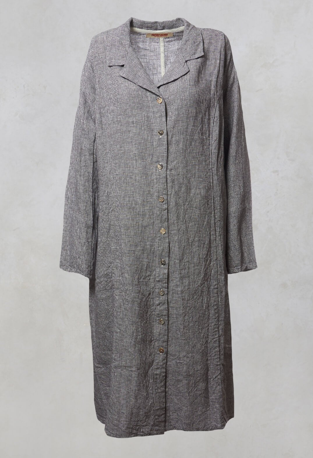 Long sleeved dogtooth lightweight coat with button up front and side pockets.