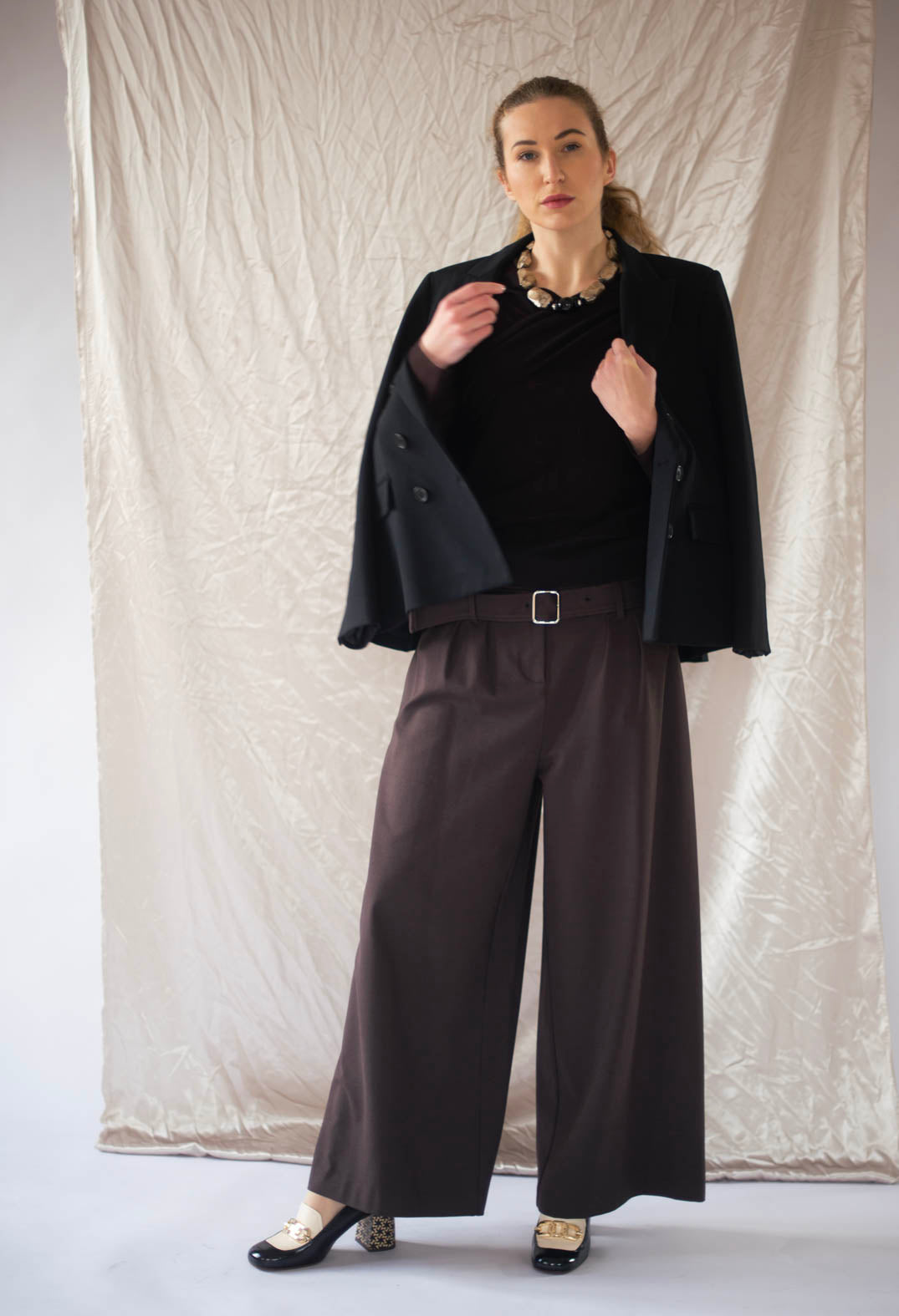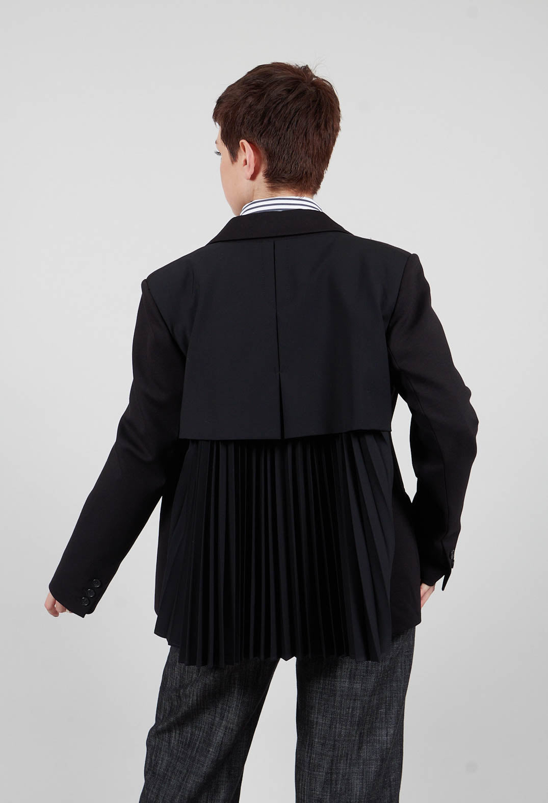 This black double-breasted blazer effortlessly combines classic tailoring with modern flair. Featuring a notched lapel and six buttons arranged in two parallel rows, it exudes timeless sophistication. The fitted silhouette and long sleeves offer a sharp, structured look, while the two flap pockets add practical detail to its polished design. A unique contrast is created with a pleated lower back, introducing an unexpected texture that elevates the overall style. Perfect for both professional and stylish evening looks, this jacket effortlessly balances tradition with a contemporary edge, making it a versatile addition to any wardrobe.