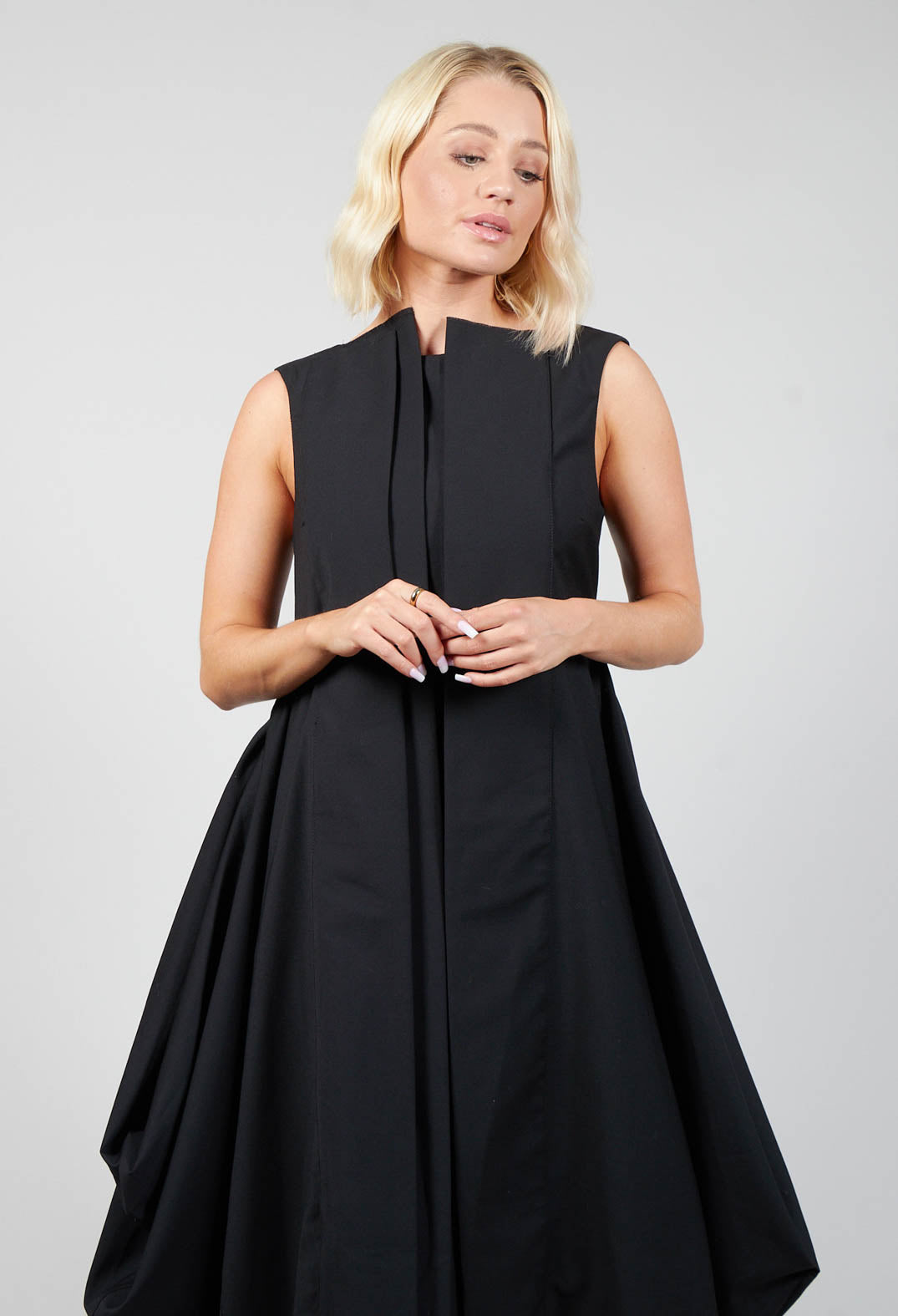 This striking dress combines modern sophistication with timeless elegance. Crafted from a smooth blend of polyester, cotton, and viscose, it features a sleeveless design with delicate pleat detailing that adds volume and movement to the silhouette. The fitted bodice leads to a flowing skirt with an asymmetrical hem, enhancing its contemporary appeal. A zip-up back ensures a seamless fit, while the understated design makes it a versatile choice for both day and evening wear. Perfect for those seeking a balance of structure and fluidity, this dress exudes effortless chic with its clean lines and artistic flair.