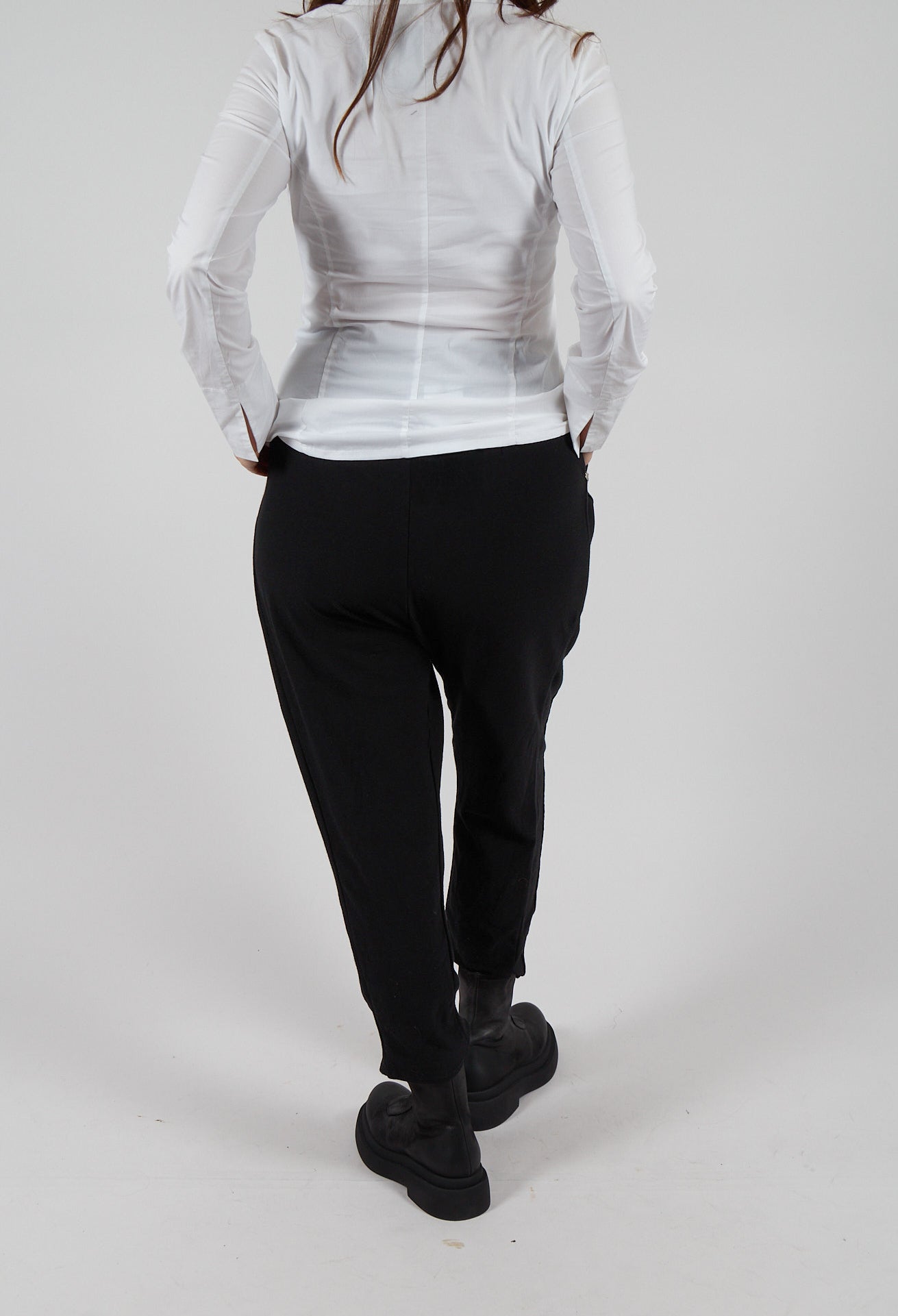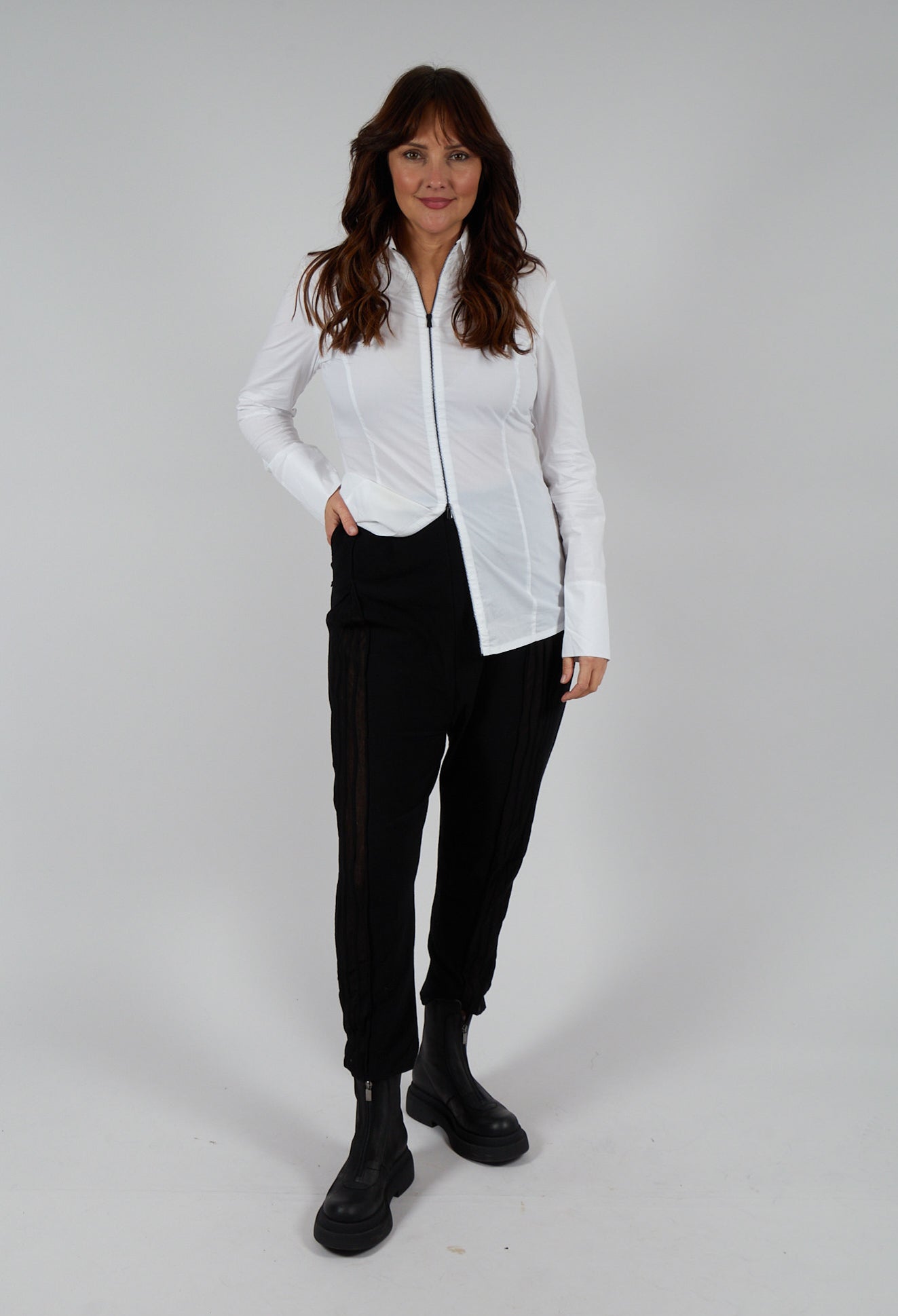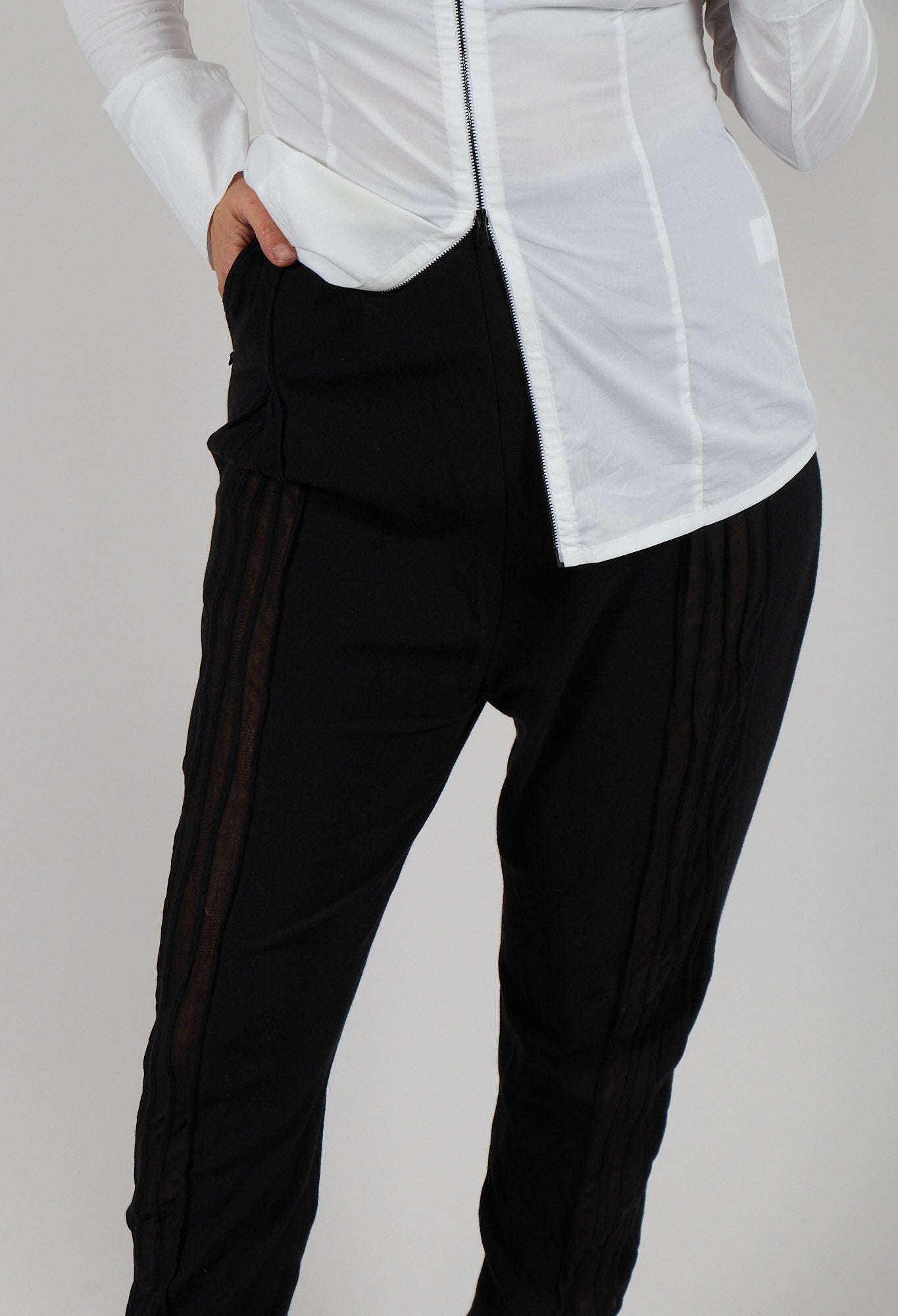 Drop crotch trousers with pleated front, side pockets, elasticated waistband and mesh panelling.