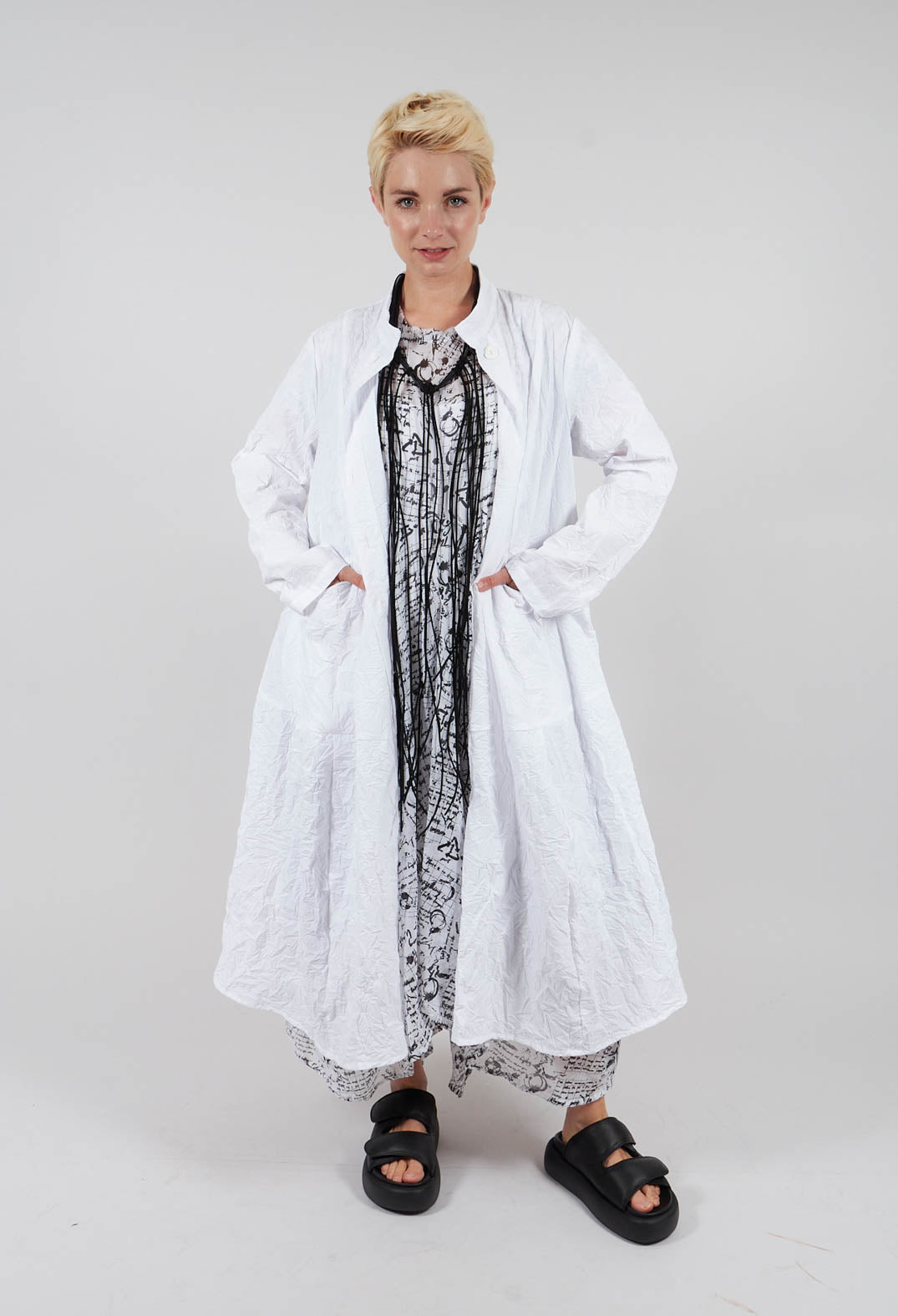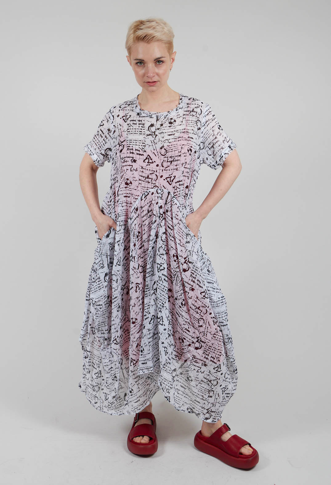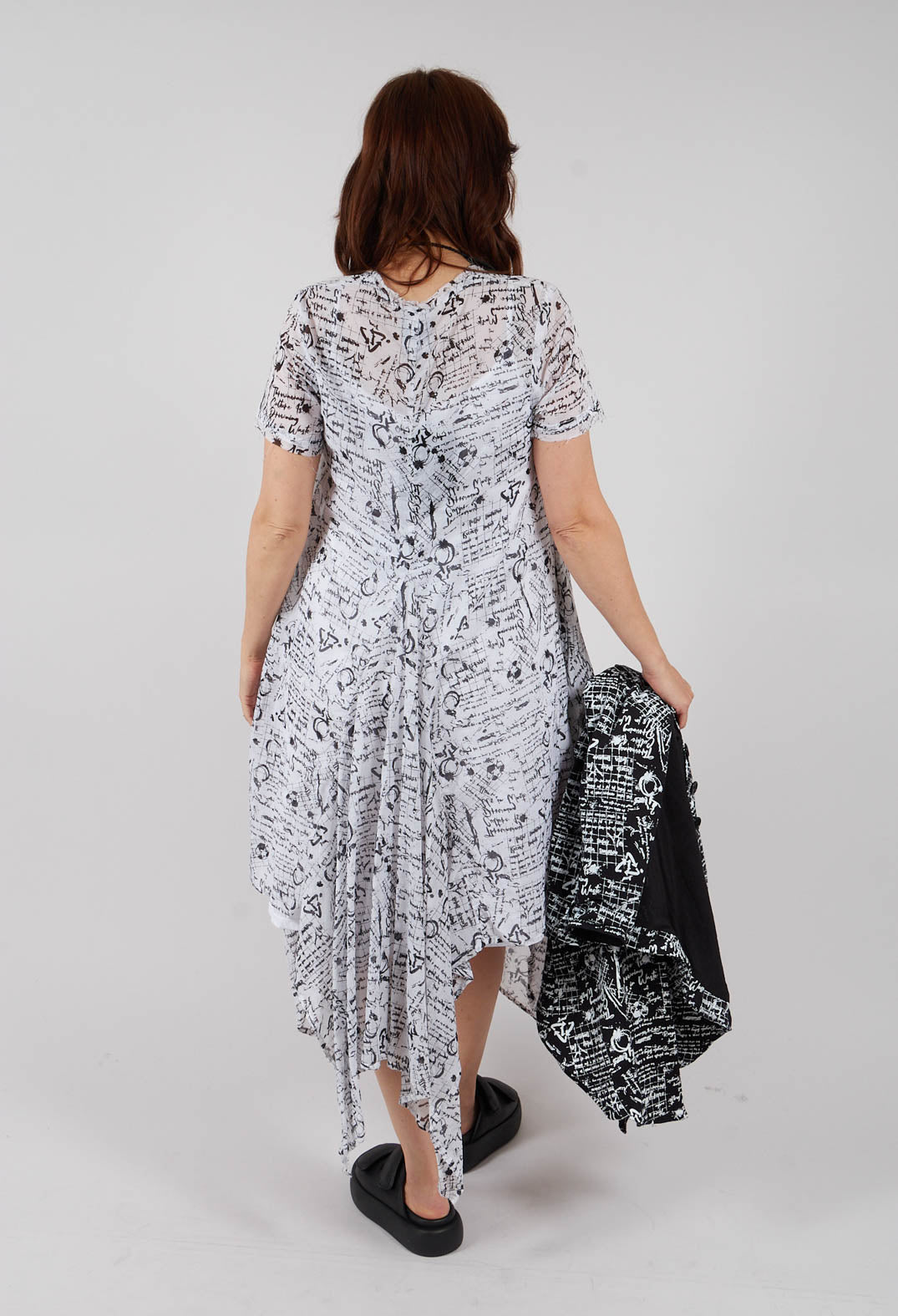 Handkerchief Hem Dress in White with Black Seregraphy