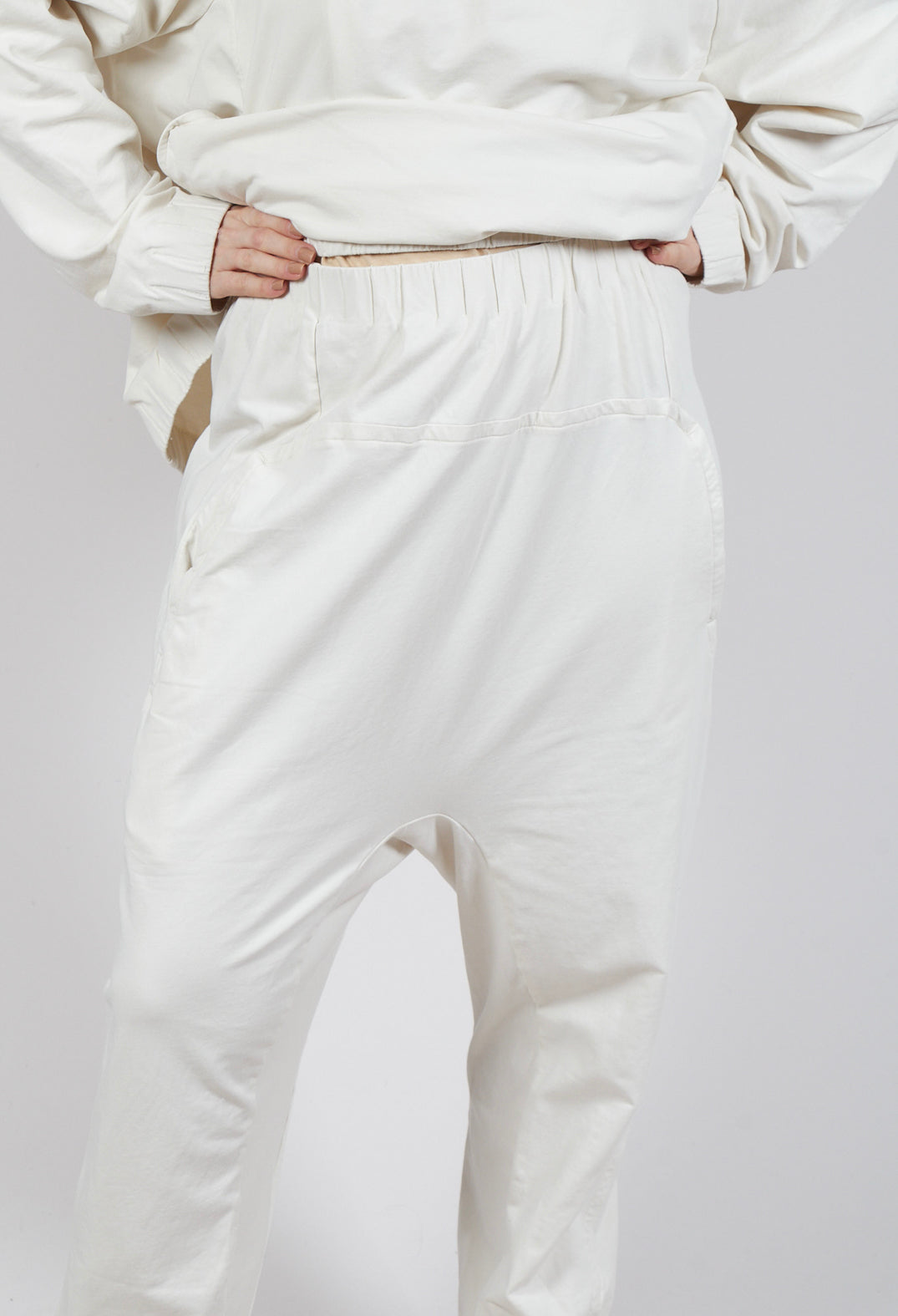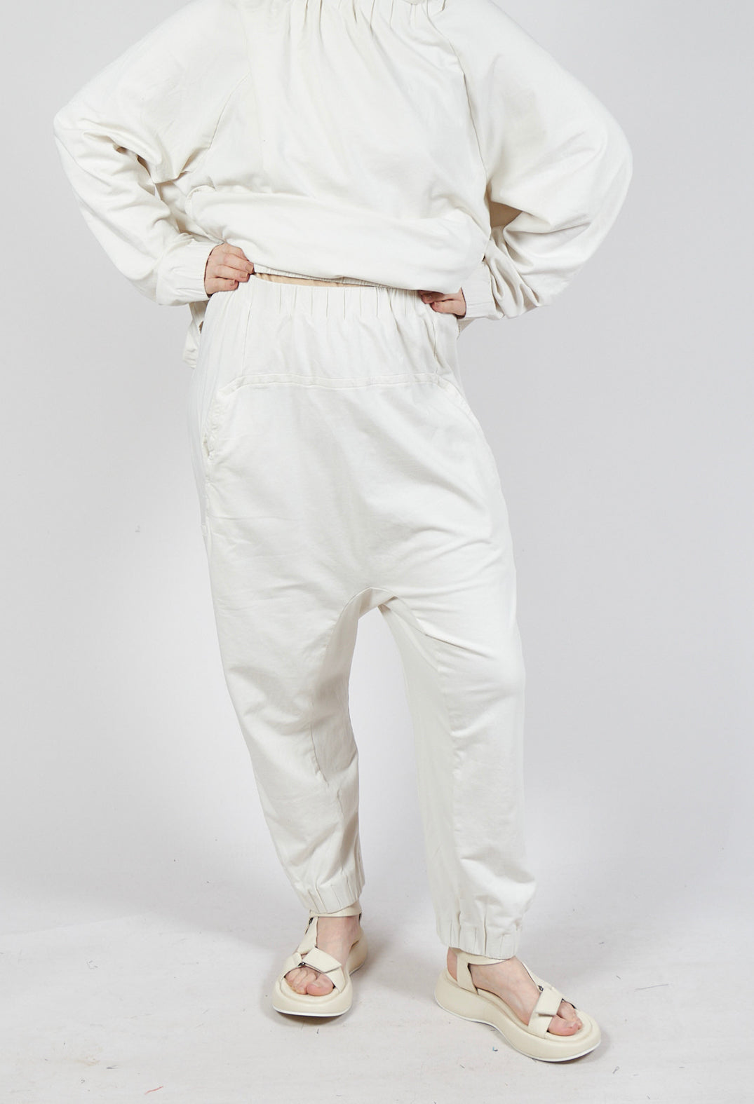 These relaxed, off-white trousers offer a simple yet stylish design, perfect for casual, everyday wear. With a loose fit and elastic waistband, they provide ultimate comfort and flexibility, while the tapered legs with elastic cuffs at the ankles give them a contemporary touch. The soft, lightweight fabric ensures ease of movement, making them ideal for laid-back days or relaxed outings. Featuring side pockets for added practicality, these trousers exude a minimalist charm, effortlessly pairing with your favourite tops for a chic and easy-going look.
