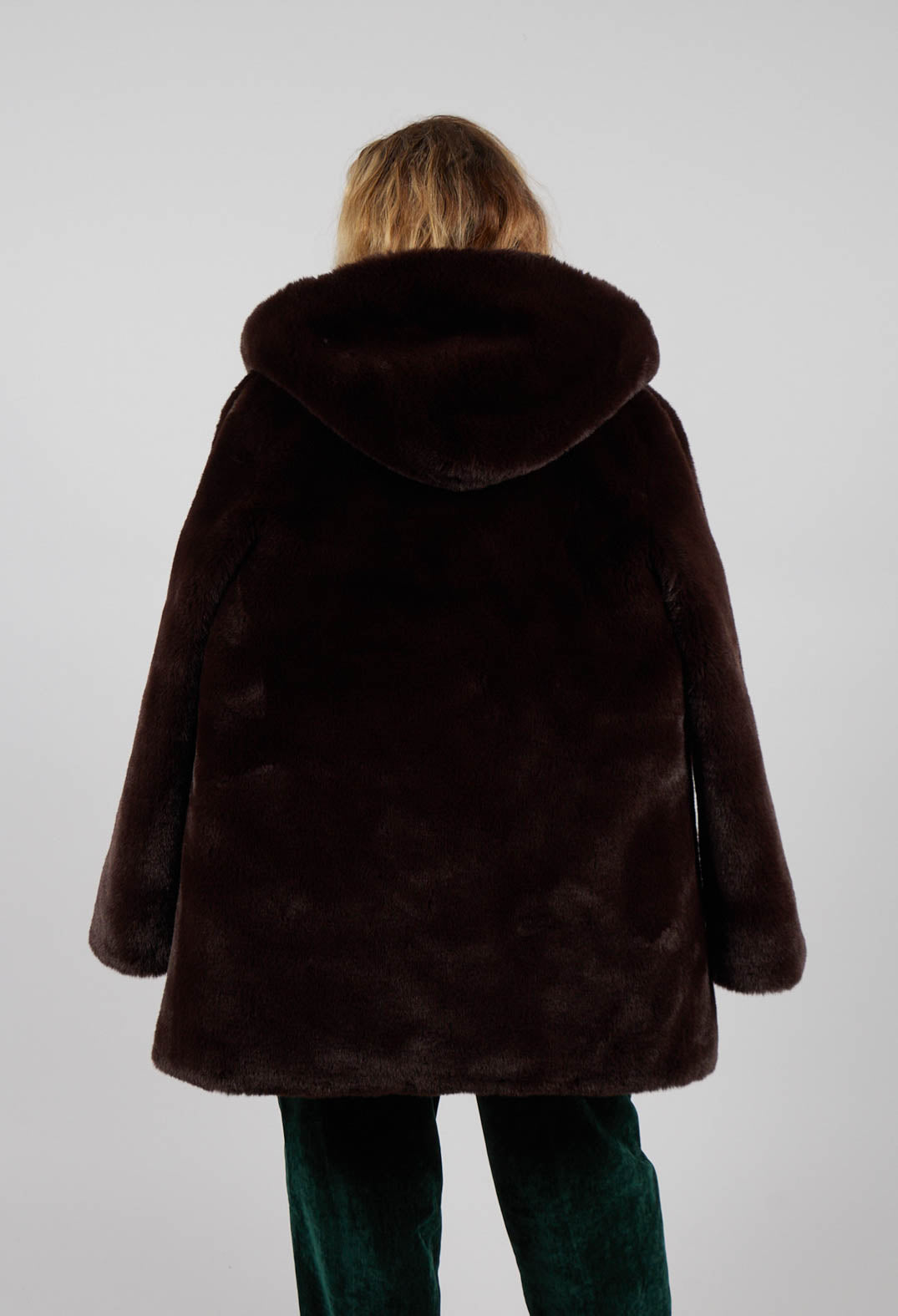 Deep brown tones and a plush, fur-like texture give this hooded coat a cosy, contemporary feel. Designed with a relaxed, slightly oversized fit, it features a large, soft hood and long sleeves, combining comfort with effortless style. Practical side pockets and a mid-thigh length add both functionality and coverage, while the luxurious, velvety fabric ensures warmth for colder days. Available in Size S (Bust 104cm / Length 80cm), Size M (Bust 108cm / Length 80cm), and Size L (Bust 112cm / Length 82cm), it is the perfect layering piece to elevate both casual and polished winter looks.