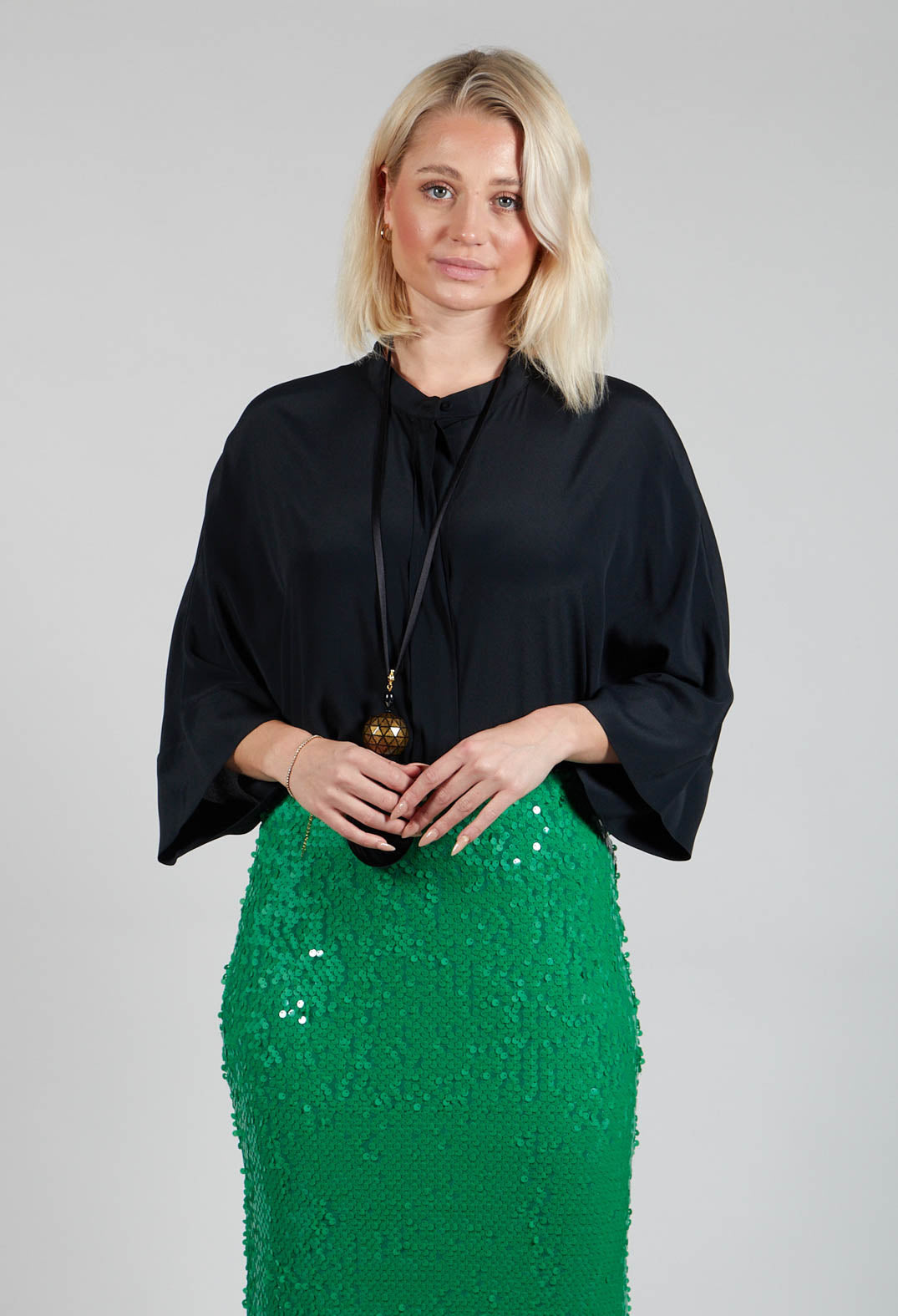 This effortlessly chic black shirt exudes contemporary sophistication with its flowing silhouette and luxurious feel. Crafted from a blend of acetate and silk, the fabric has a soft sheen that drapes beautifully, offering a relaxed yet refined fit. Wide, three-quarter length sleeves add a touch of drama, while the concealed button placket keeps the design clean and minimal. A simple round collar completes the look, making this shirt a versatile piece that seamlessly transitions from day to evening, perfect for pairing with tailored trousers or casual jeans alike.