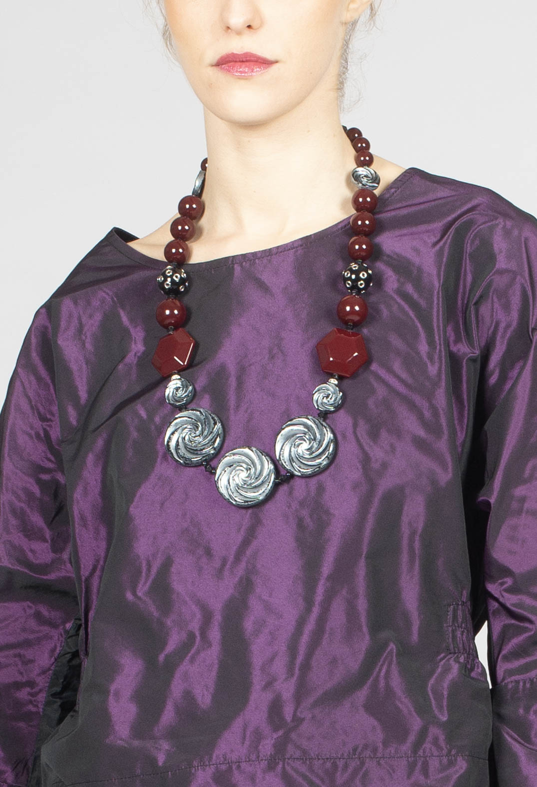 This deep plum satin-like top offers a refined yet relaxed aesthetic, perfect for effortlessly transitioning between casual and more polished looks. Featuring a round neckline and long sleeves, the top is crafted from lightweight, slightly crinkled fabric that adds texture and visual interest. The loose-fitting silhouette falls gracefully with a straight hemline, while the subtle sheen enhances its elegance. The plum satin cuffs add a sophisticated pop of colour, contrasting beautifully with the deep base, making this piece an ideal choice for both laid-back days and more formal occasions.