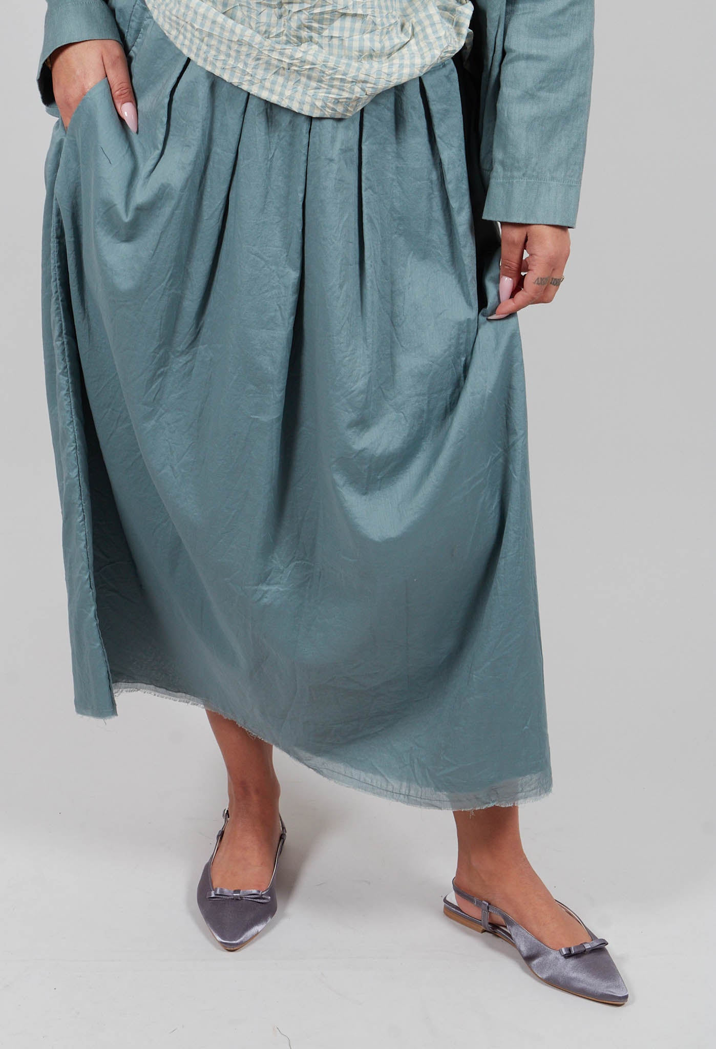 This midi-length skirt in a soft, muted blue-grey hue effortlessly combines style and comfort. The high waist with an elastic band ensures a flattering, comfortable fit, while the subtle pleating adds volume and texture, giving the skirt a relaxed yet elegant silhouette. The lightweight fabric, with its delicate sheen and slightly crinkled texture, enhances its airy, fluid drape, making it perfect for both casual and more polished looks. Practical side pockets add a functional touch, while the unfinished hem creates a laid-back, contemporary feel, making this skirt an easy-to-wear piece for any occasion.