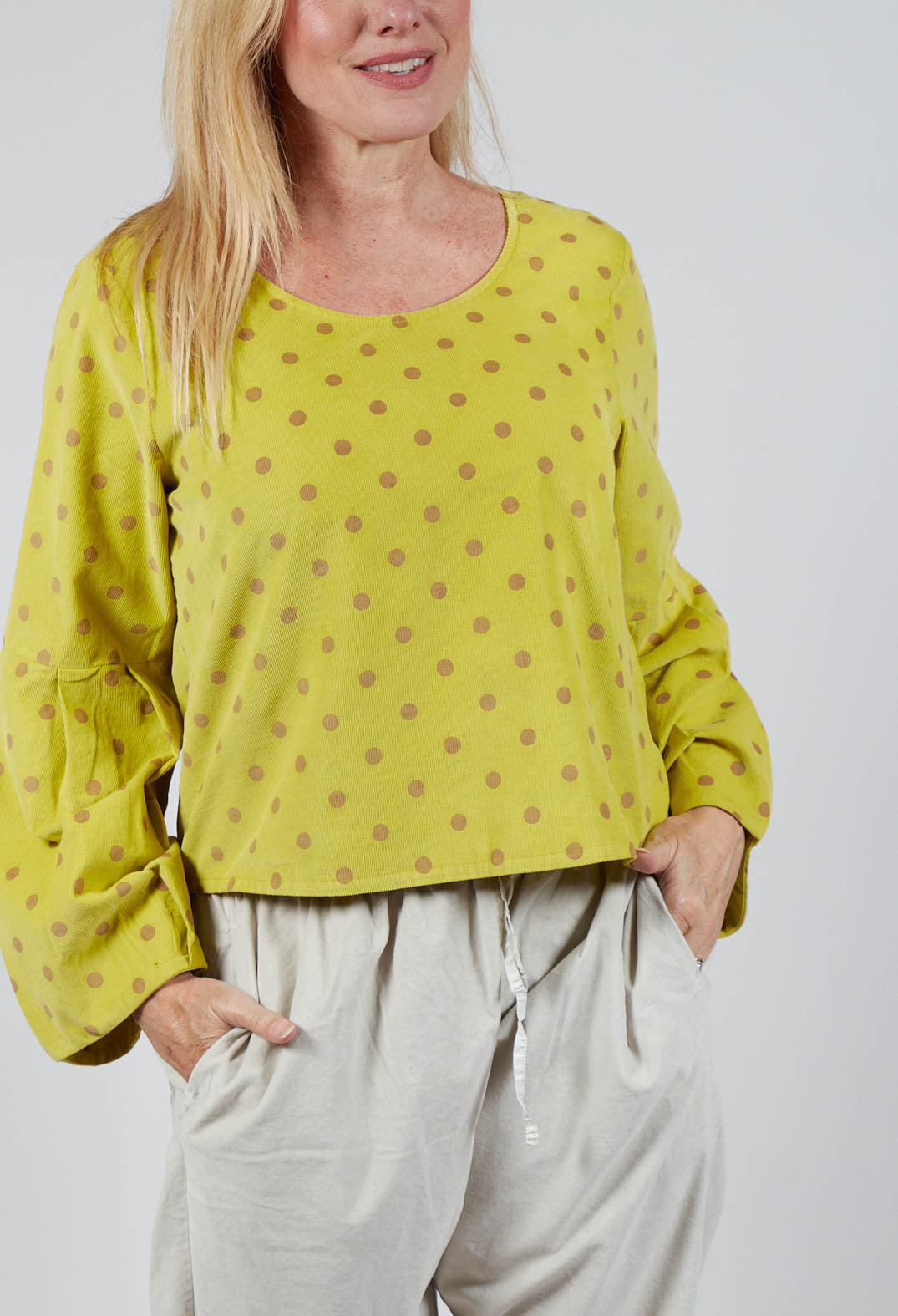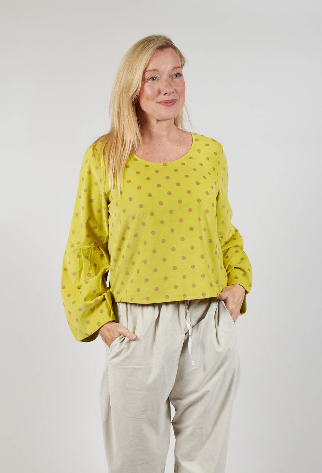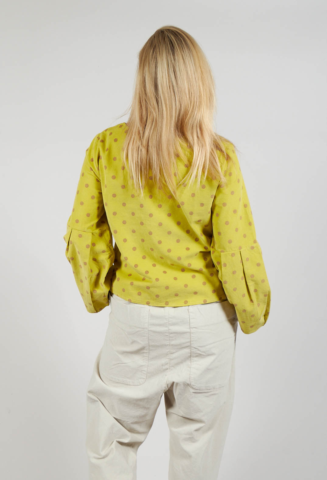 Polkadot Needlecord Puffed Sleeve Top in Acid Green