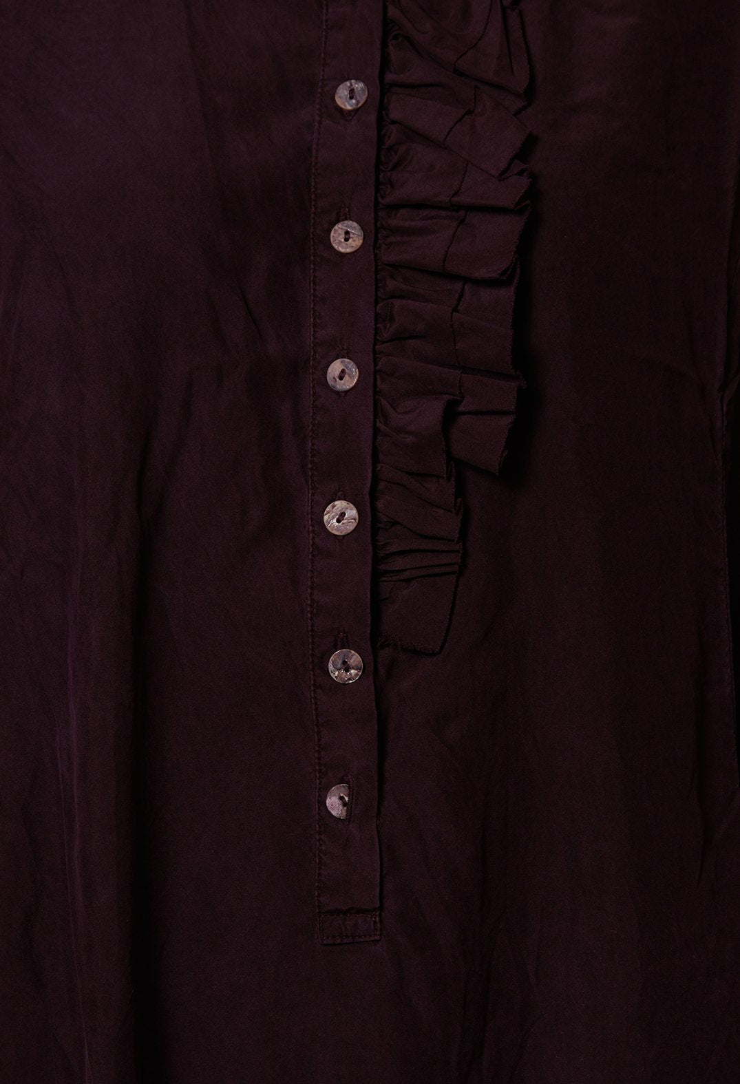 Burgundy long sleeved midi dress with button up front, ruffle detail and side pockets.