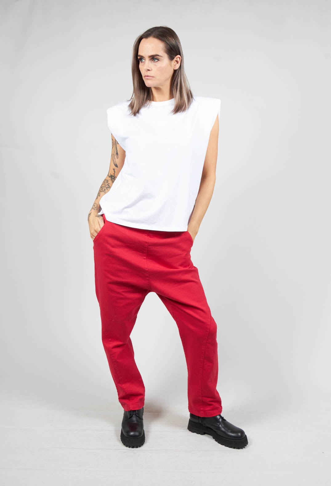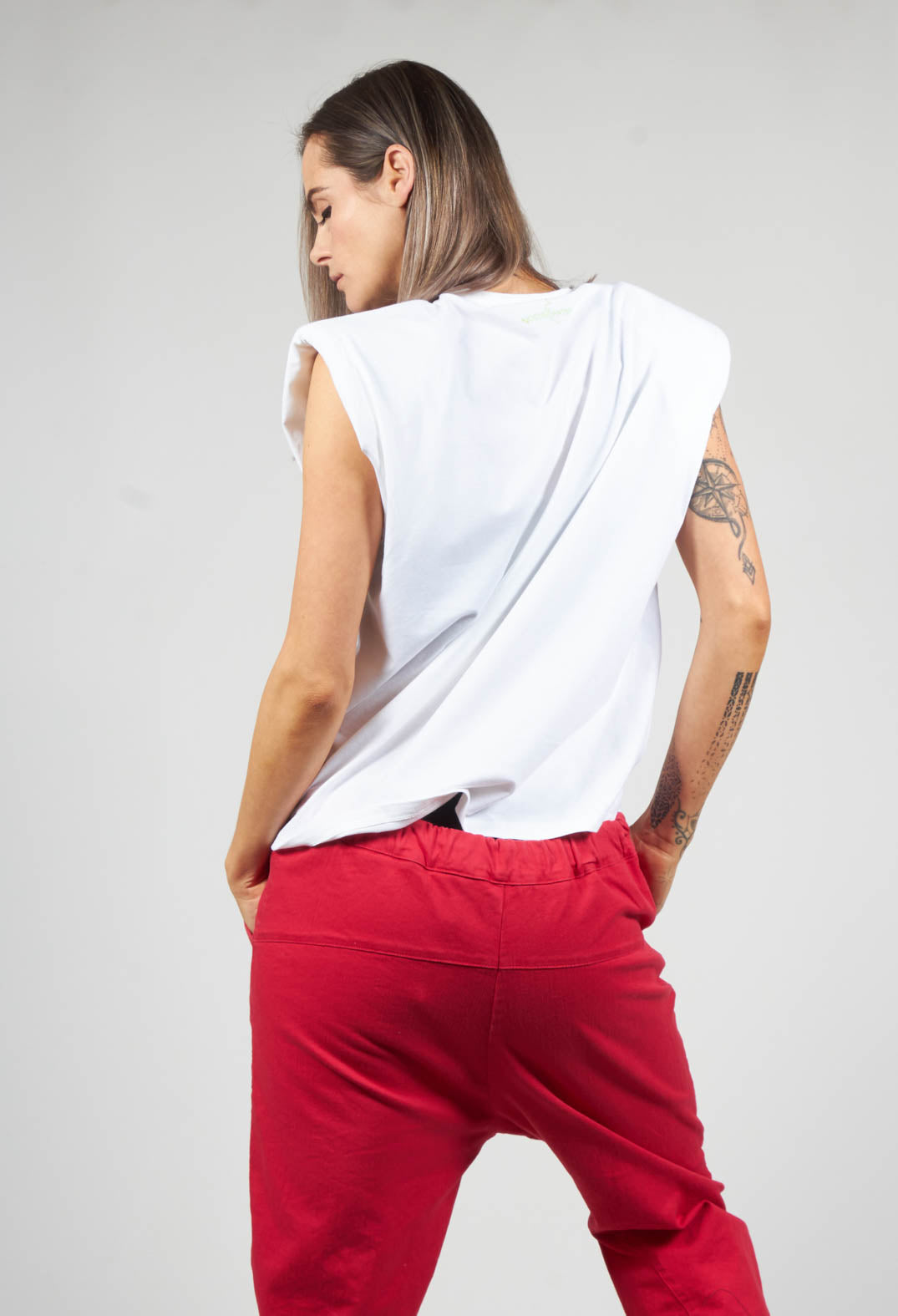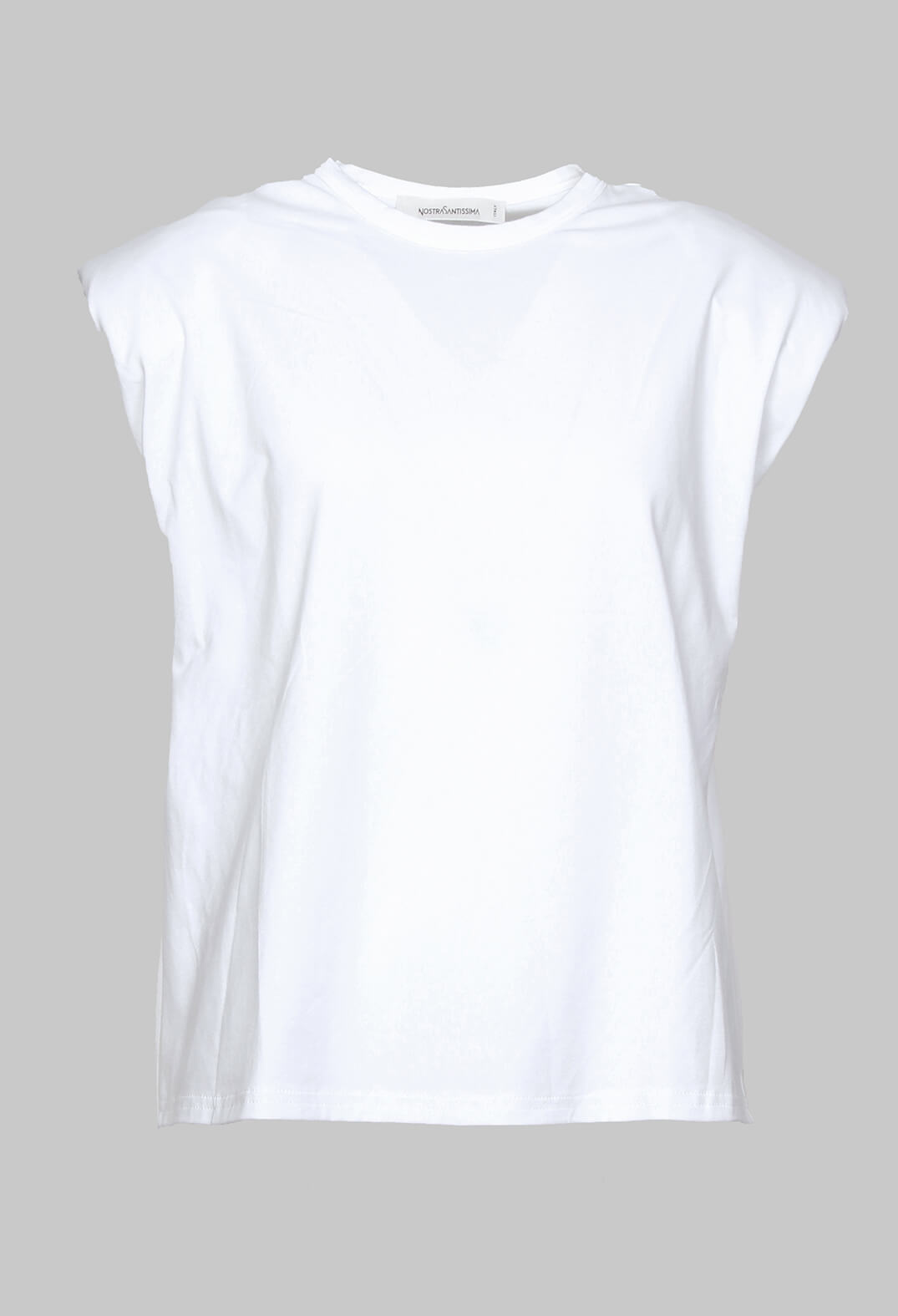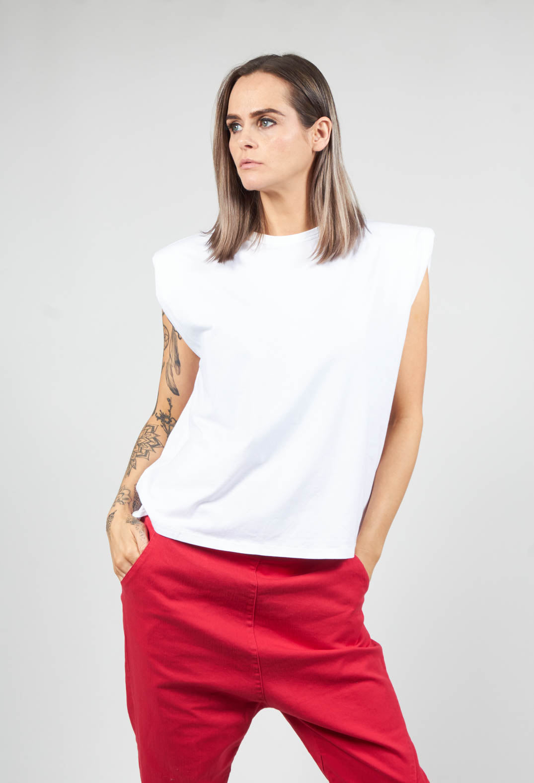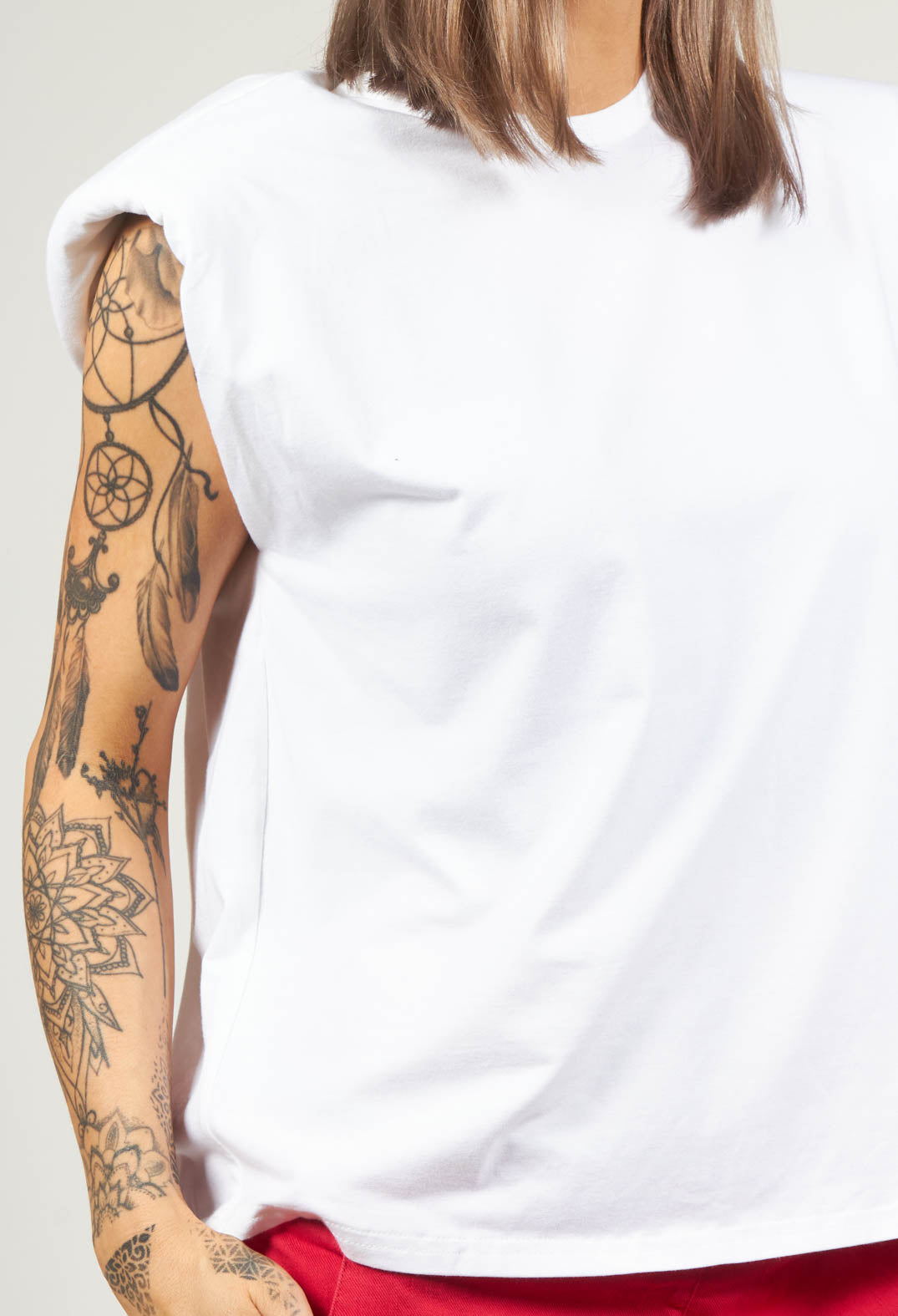 Crisp white fabric and structured shoulder pads give this sleeveless top a sharp, contemporary feel. Clean lines and a minimalist cut make it an ideal base for layering under blazers, cardigans, or statement jackets. Its versatile style transitions easily from workwear to elevated casual outfits.