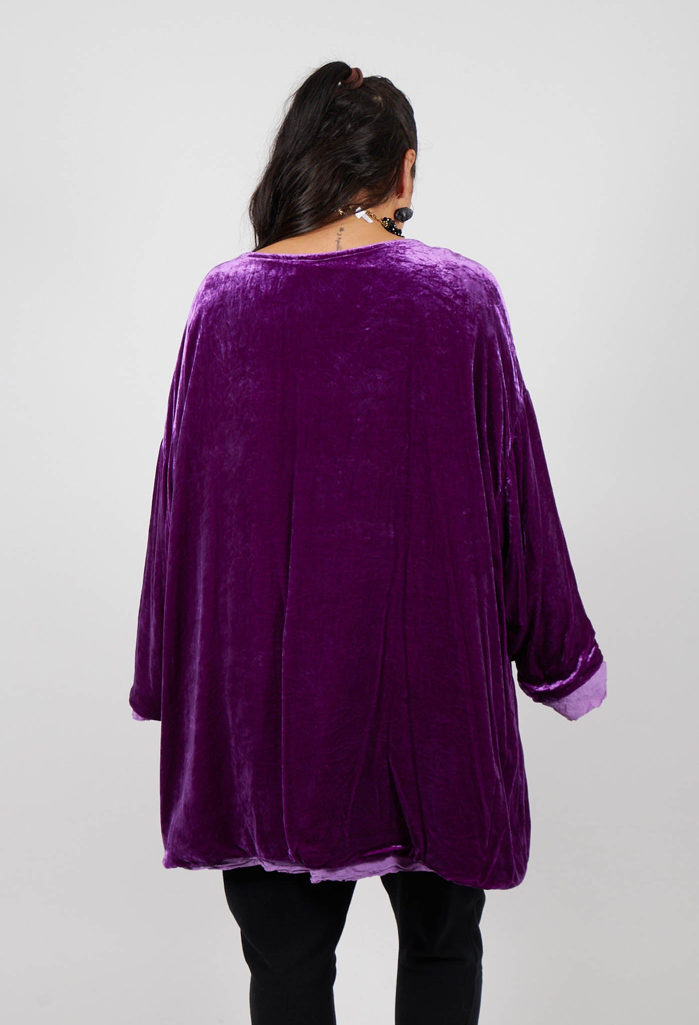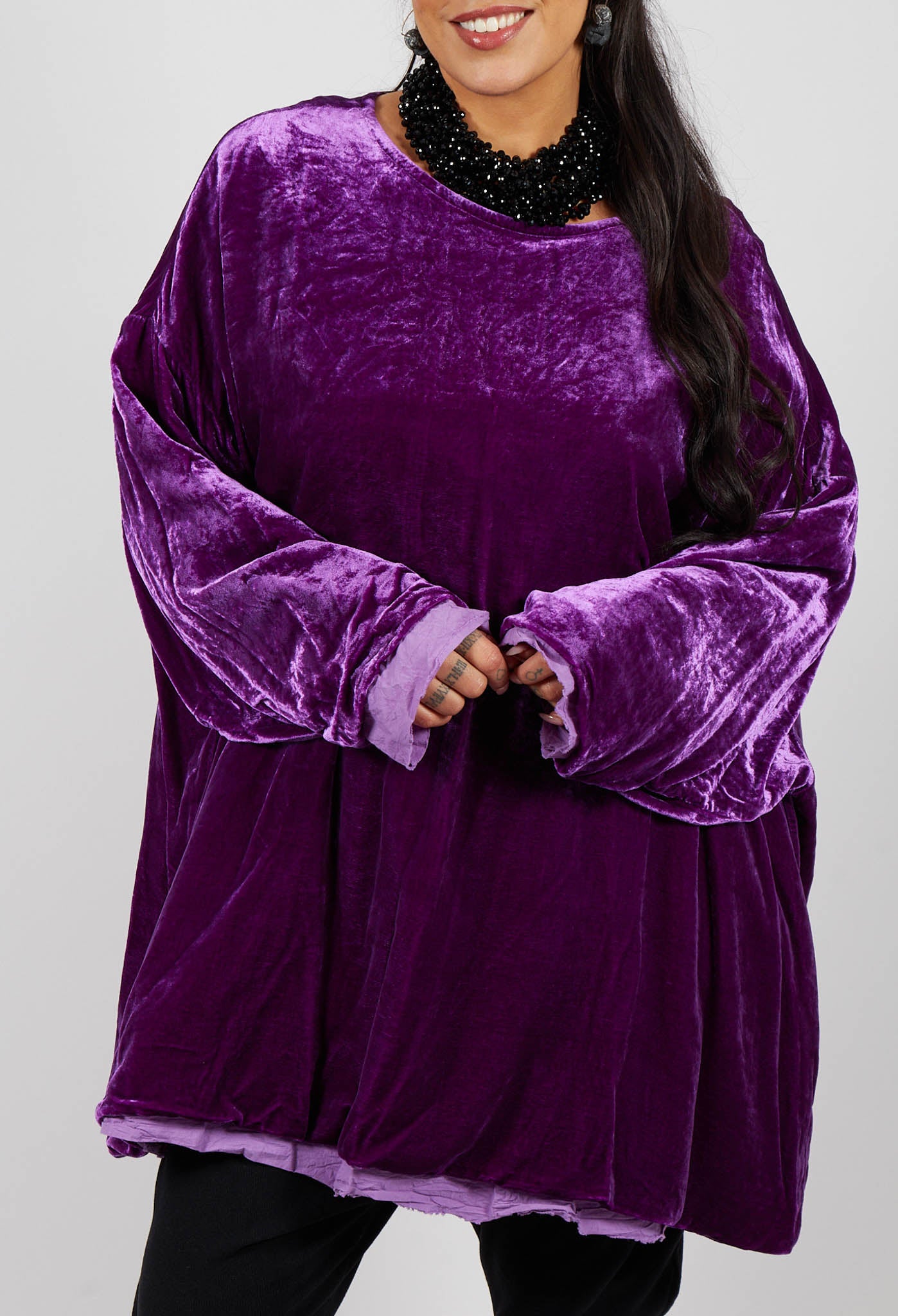 This deep purple jumper effortlessly blends luxury and comfort. Crafted from a rich, velvety fabric, it features a relaxed, oversized silhouette with long sleeves and a rounded neckline, offering an effortlessly elegant look. The subtle sheen of the fabric enhances its refined appeal, while the layered cuffs, with lighter purple fabric peeking through, add a unique touch to the design. Perfect for both casual days and more polished occasions, this jumper provides a chic, laid-back style that pairs beautifully with both relaxed and semi-formal looks.