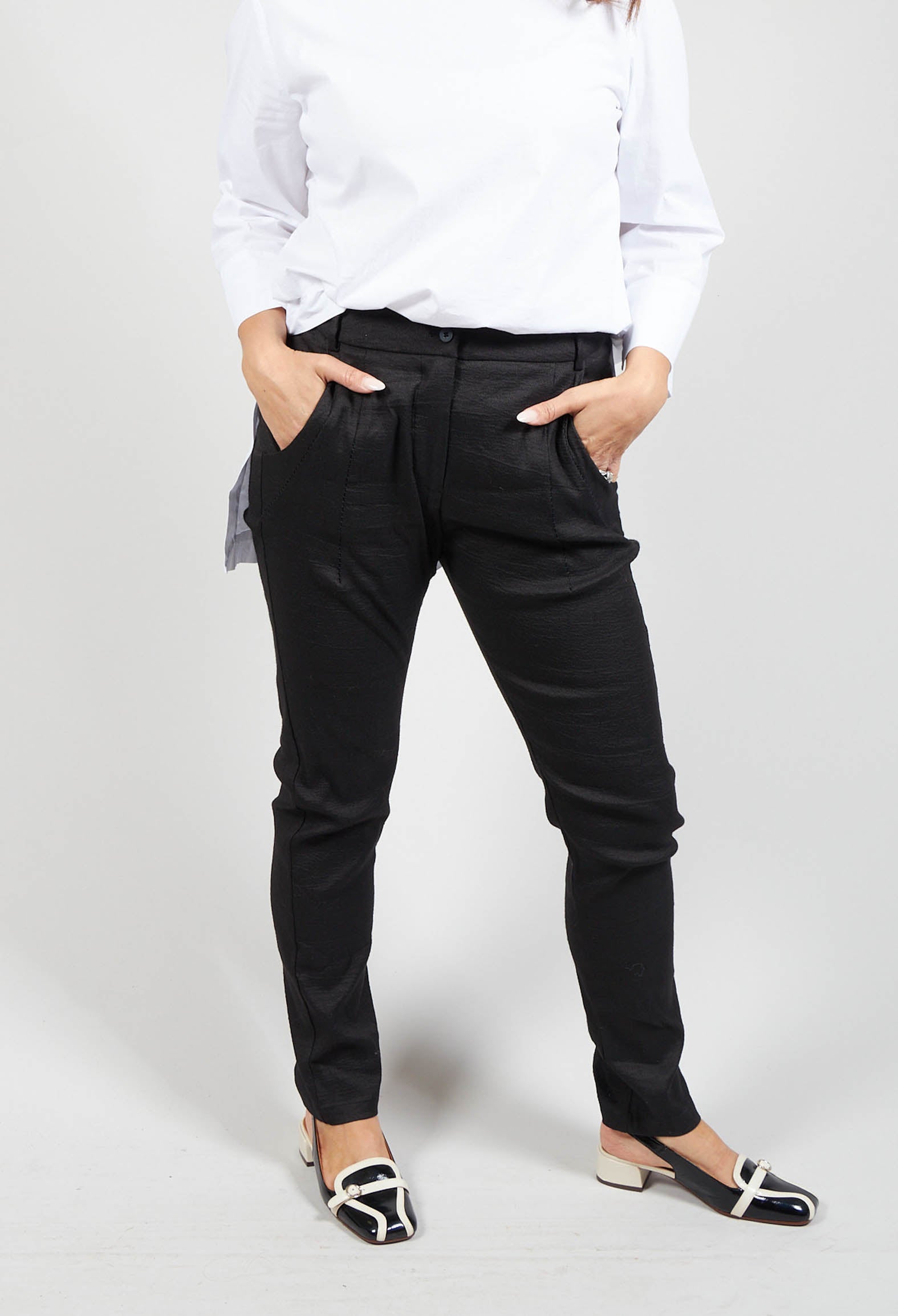 Straight leg trousers in noir with pockets and buckle detail on the reverse.