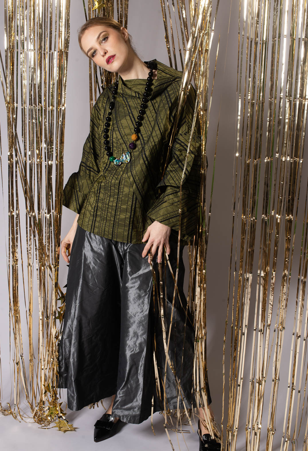 Olive green tones and a striking pattern of black stripes give this top a bold, contemporary edge. Featuring a high, structured collar and voluminous, sculpted sleeves, the design blends modern tailoring with an artistic flair. The textured, slightly crinkled fabric adds depth, while the subtly tailored back ensures a flattering silhouette. Perfect for elevating both casual and statement-making outfits with ease.